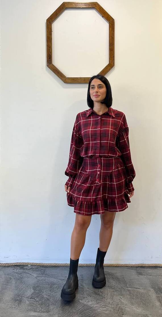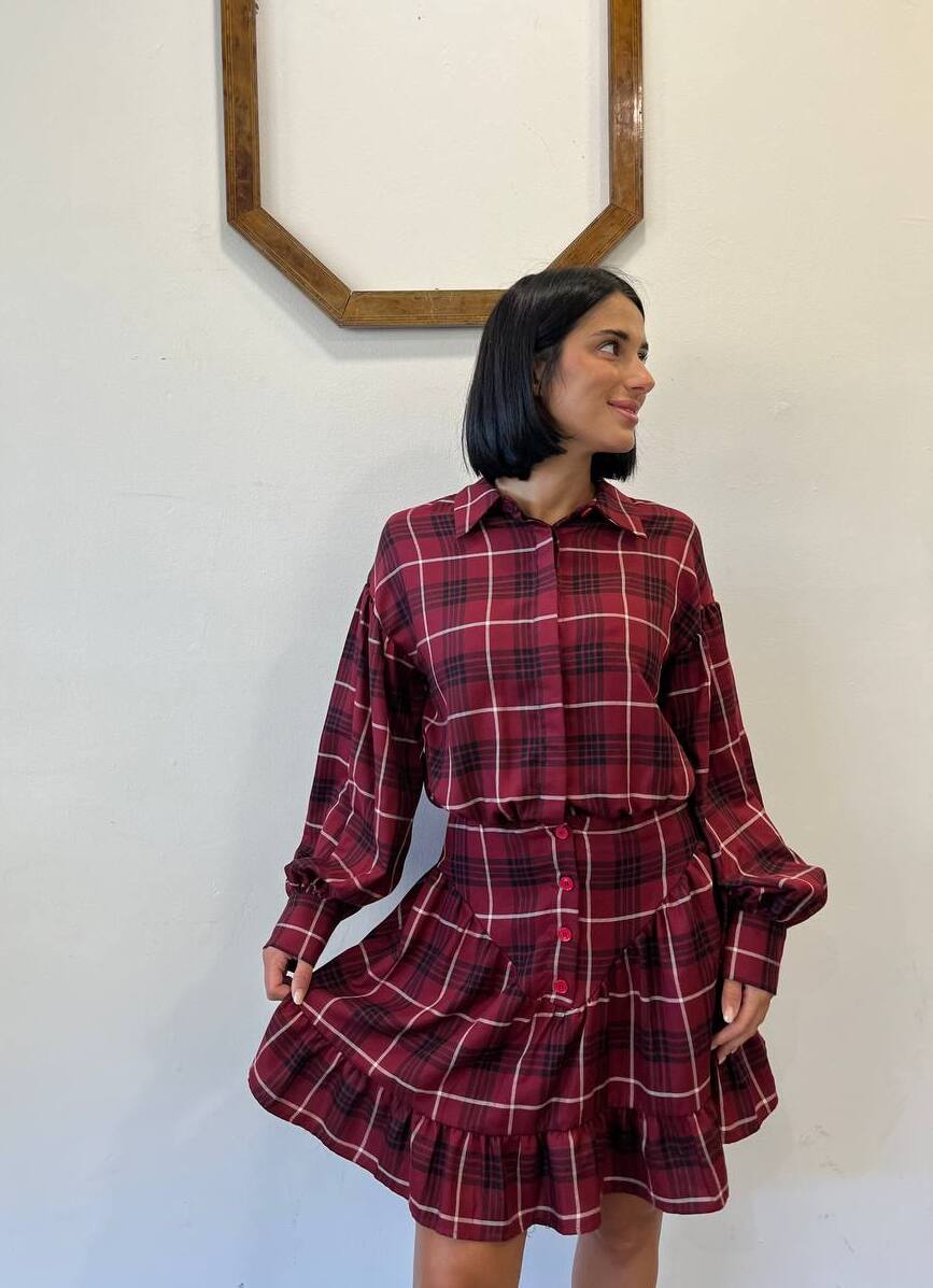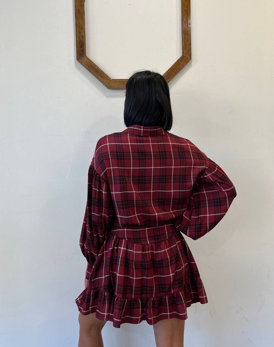 Abito chemisier corto in fantasia tartan nelle tonalità del rosso, bordeaux e bianco. Presenta un colletto classico, una chiusura con bottoni e una manica lunga con polsino. Il punto vita è evidenziato da un elastico che crea un effetto arricciato, mentre il fondo della gonna a balze dona un tocco romantico e sbarazzino. Un capo versatile per un look casual o per occasioni speciali.