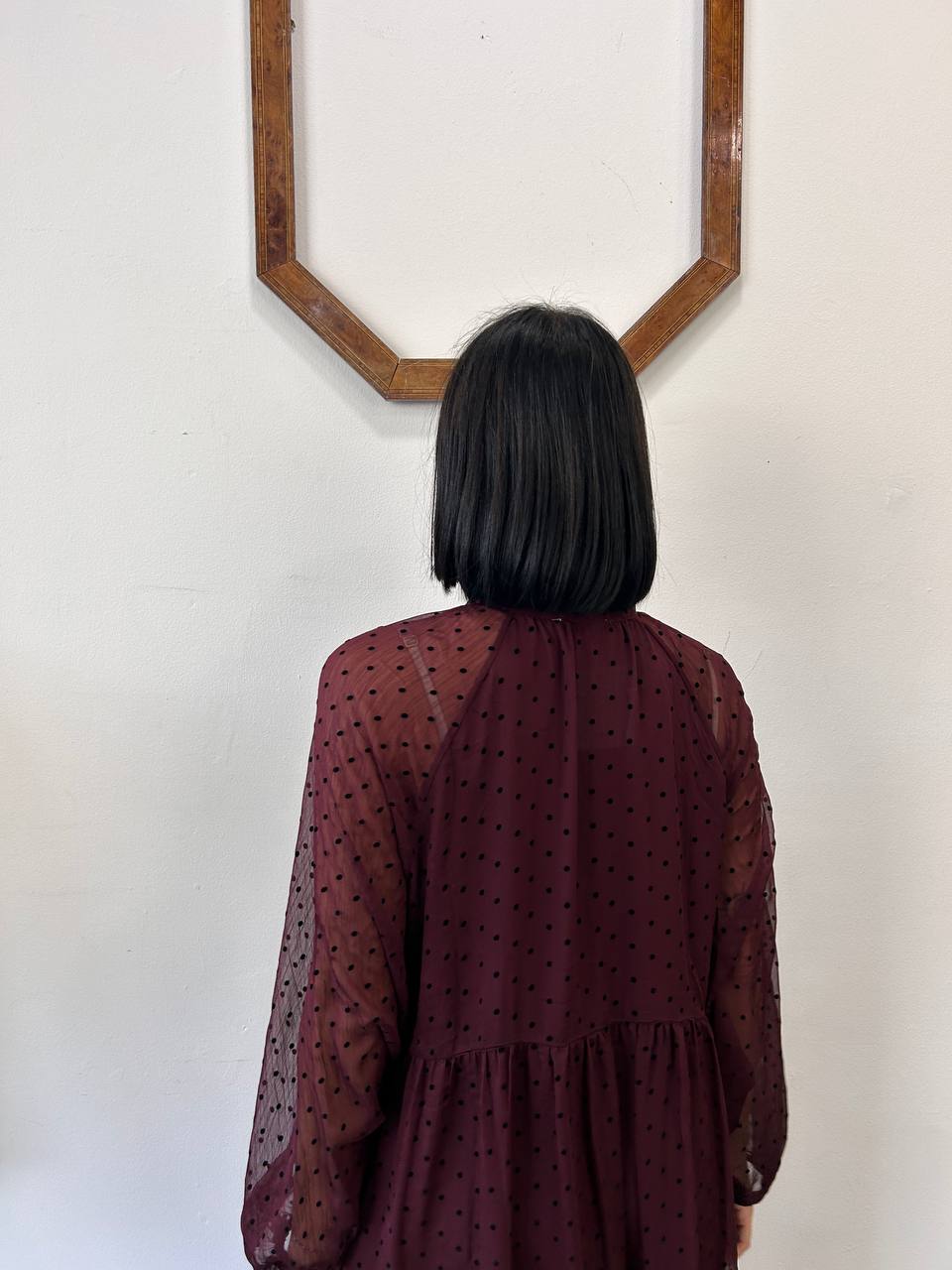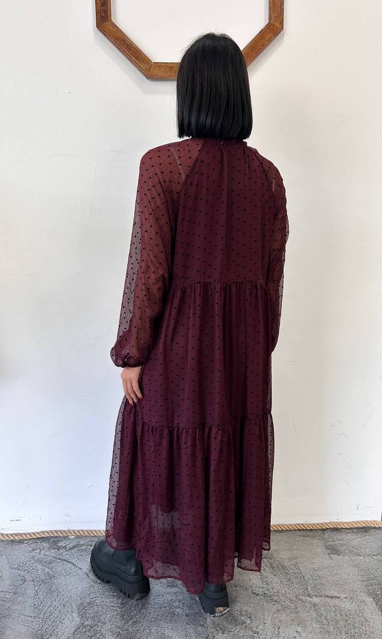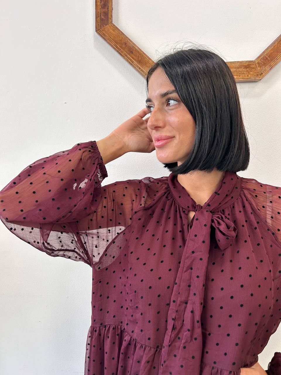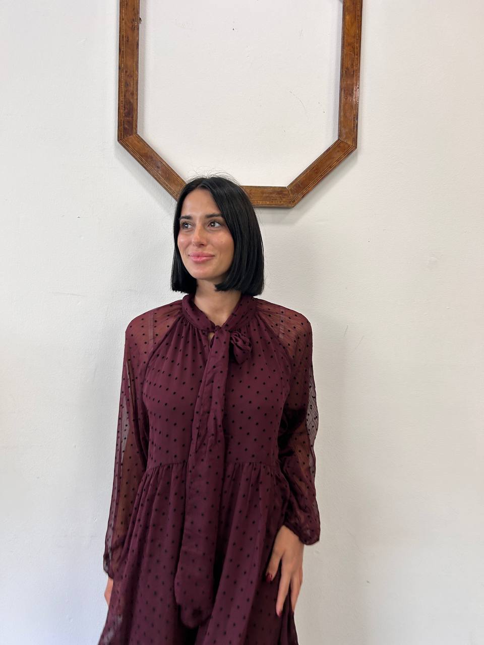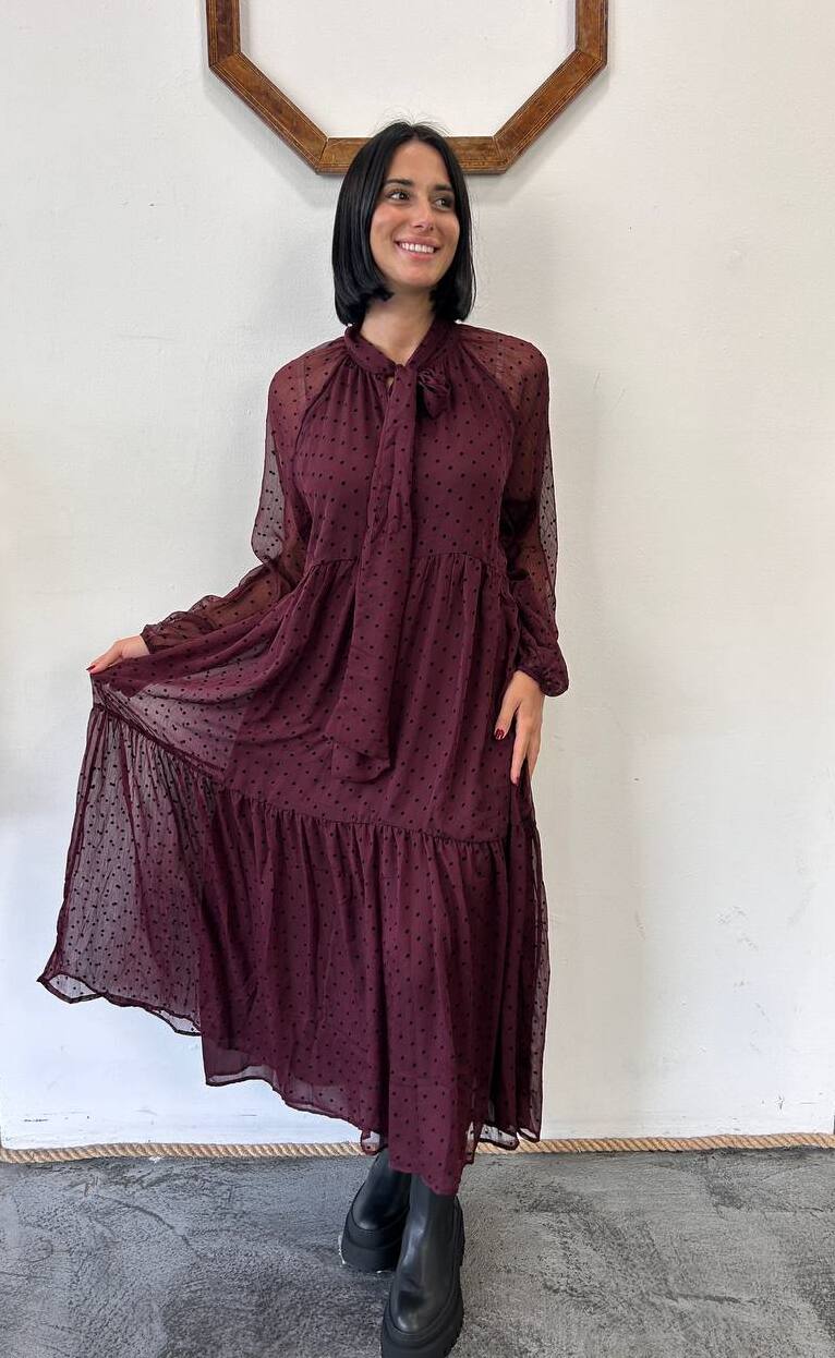 Abito lungo in tessuto georgette, caratterizzato da una vivace fantasia a pois. Fiocco e manica trasparente. Perfetto per un look bohémien e raffinato. Morbido e leggero.