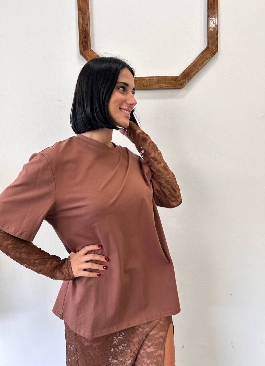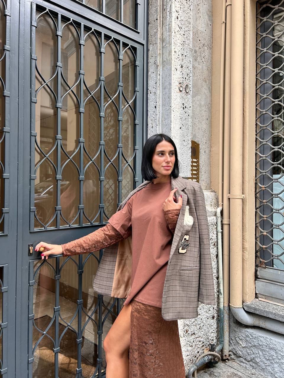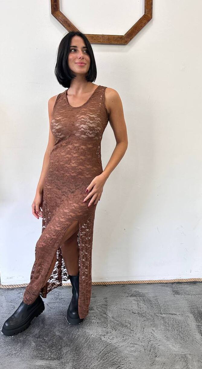Abito composto da 2 pezzi: abito lungo in pizzo e t-shirt con maniche in pizzo. L'abito lungo è realizzato in pizzo con una lavorazione che unisce motivi floreali e geometrici. Ha un taglio dritto e uno spacco laterale che lo rendono sensuale ed elegante. La spallina sottile lo rende perfetto da indossare sopra una t-shirt o una camicia. La t-shirt a manica lunga con pizzo a fantasia è ideale per un look casual-chic. Il tessuto leggero e fluido la rende comoda e facile da abbinare.