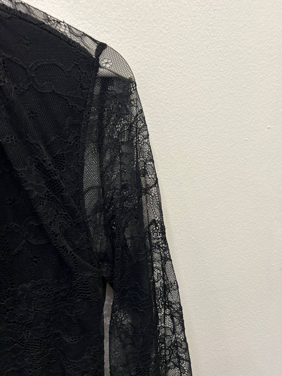 Interamente realizzato in pizzo delicato, presenta una silhouette fluida e una lavorazione intricata che aggiunge un tocco di eleganza. Il fiocco in pizzo sul collo, con un'elegante apertura a V sul busto, conferisce un dettaglio chic e sofisticato. È l'abito ideale per una cerimonia o una serata speciale.