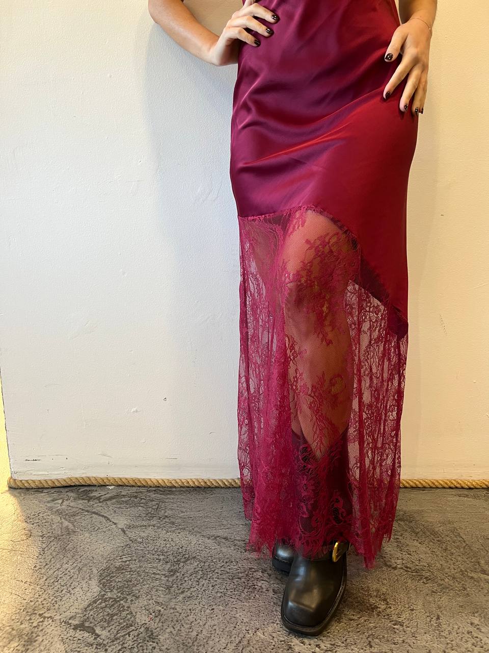 Questo abito presenta una vestibilità morbida, realizzato in un elegante tessuto di raso. Il design è caratterizzato da una scollatura ampia e da un dettaglio distintivo: un inserto in pizzo, che aggiunge un elemento di contrasto e sensualità.