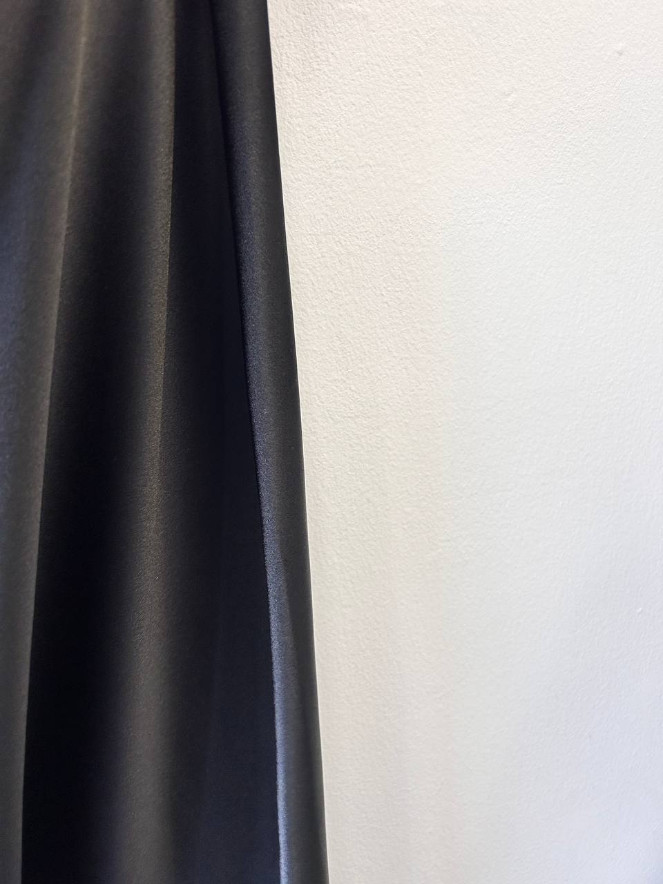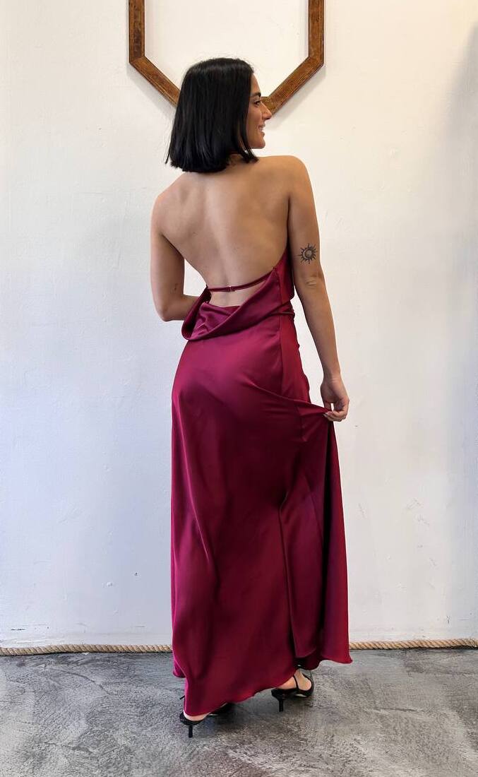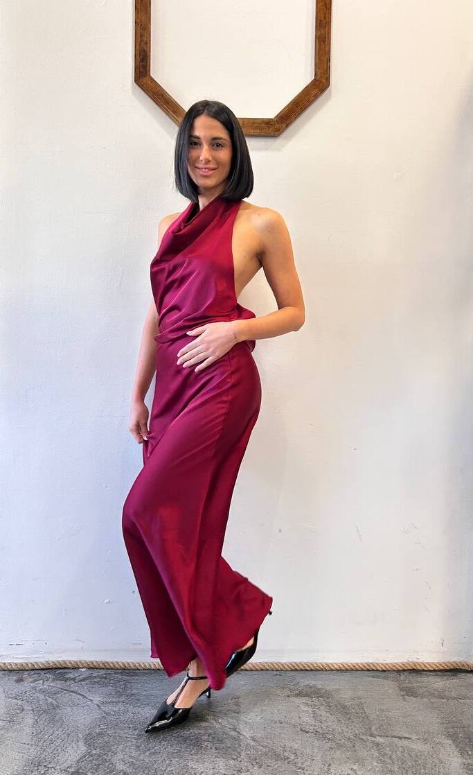 Questo abito è un vestito lungo in tessuto fluido che scende fino ai piedi. È caratterizzato da uno scollo all'americana con drappeggio sul davanti e un ampio scollo sulla schiena.