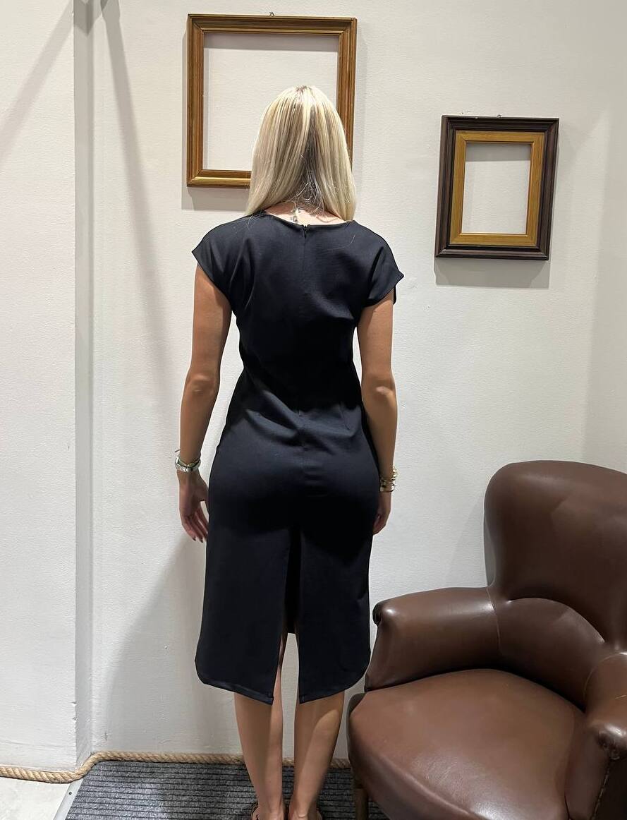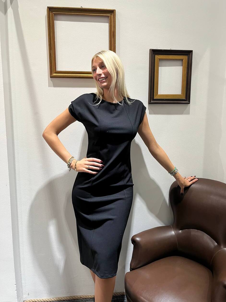 Questo abito è un capo versatile e raffinato, dal taglio elegante e strutturato. Realizzato in un tessuto punto Milano, presenta un design a maniche corte e un comodo scollo a V, ideale per un look da giorno o da sera. La sua linea pulita e ben definita lo rende un capo essenziale nel guardaroba.
