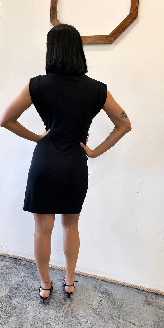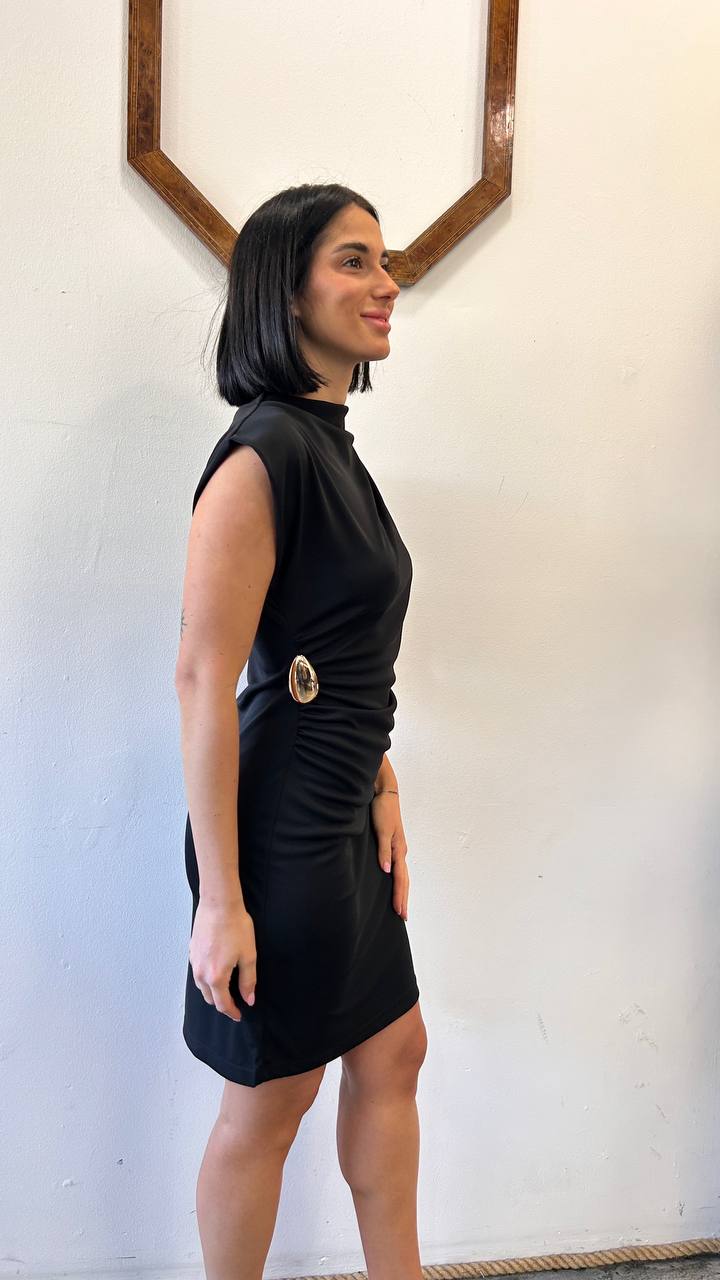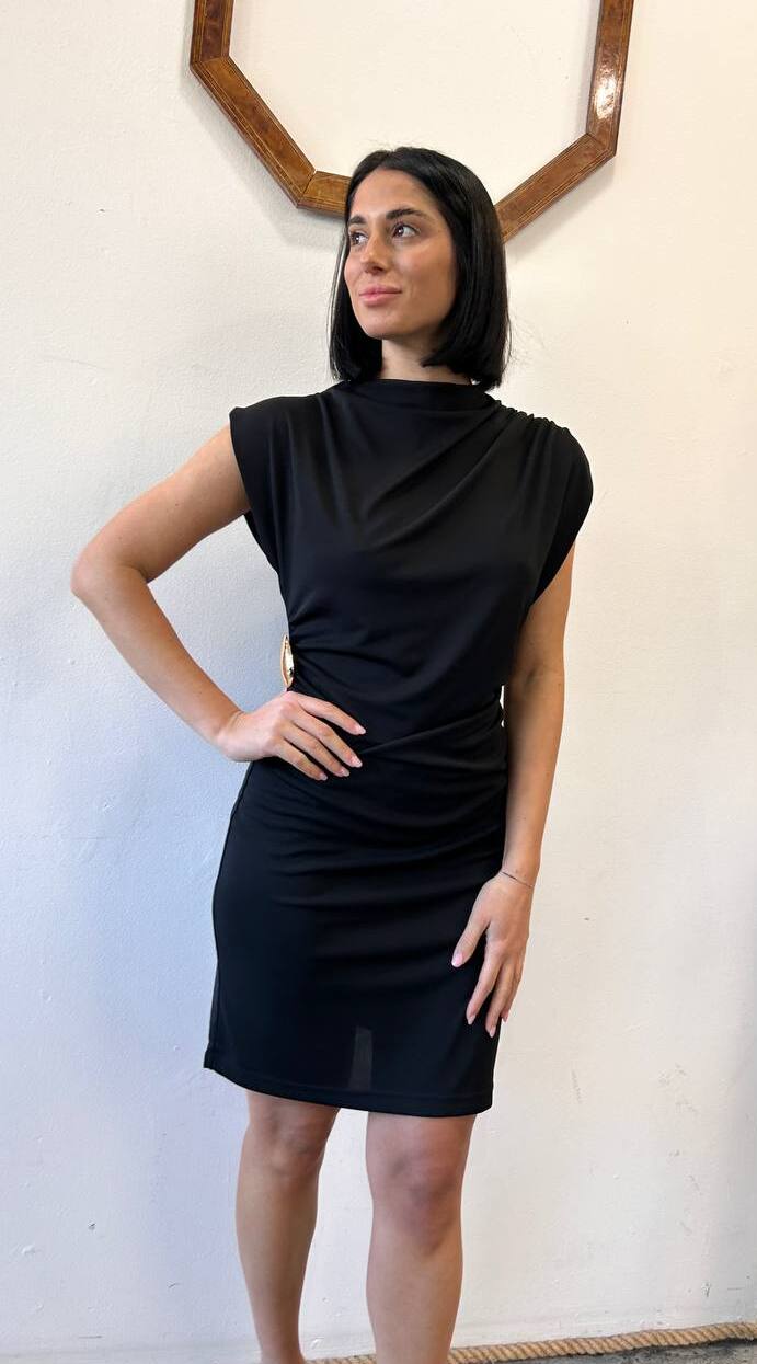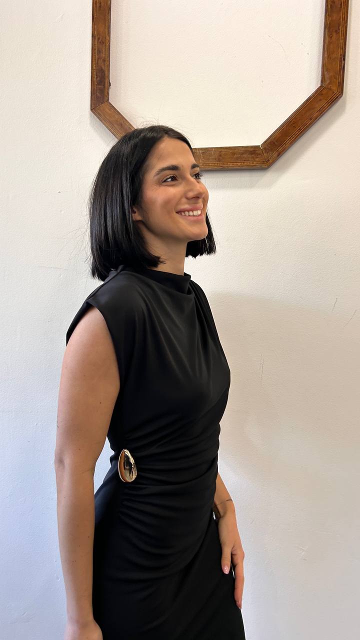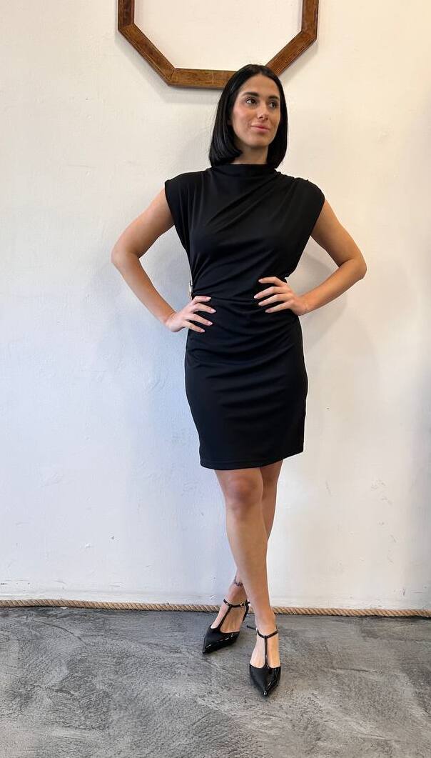 Questo abito smanicato, presenta una vestibilità a tubino. È caratterizzato da una linea pulita con maniche strutturate e da un drappeggio laterale fermato da una spilla.