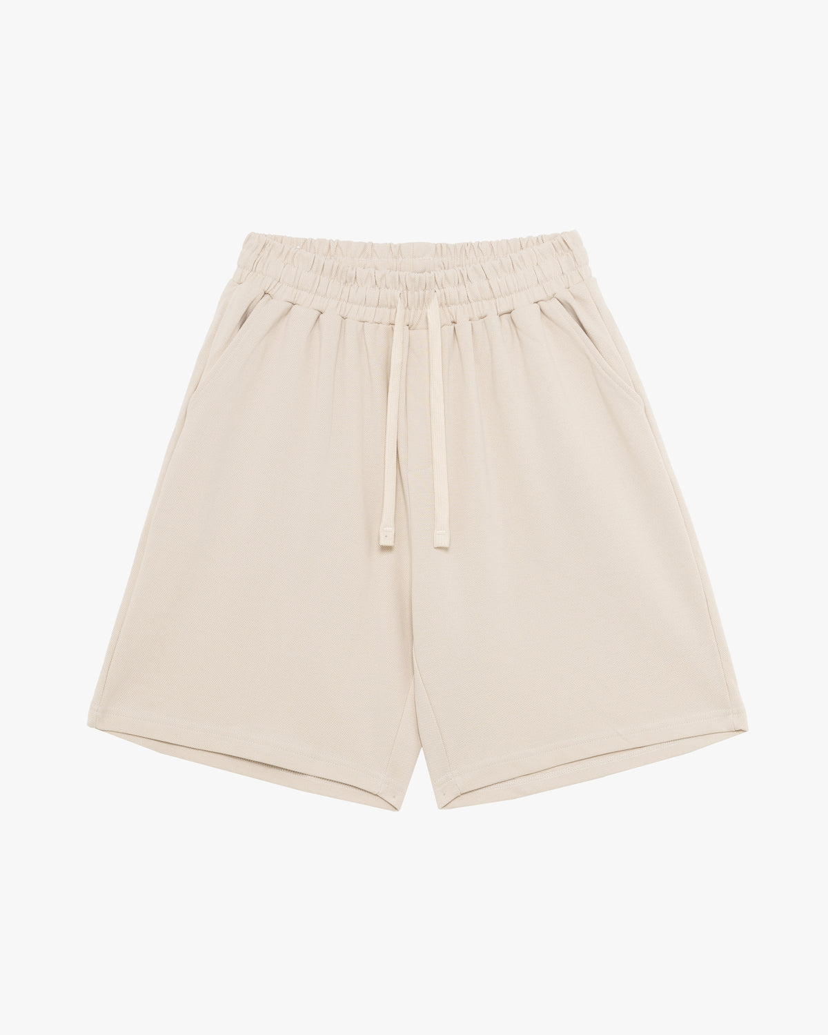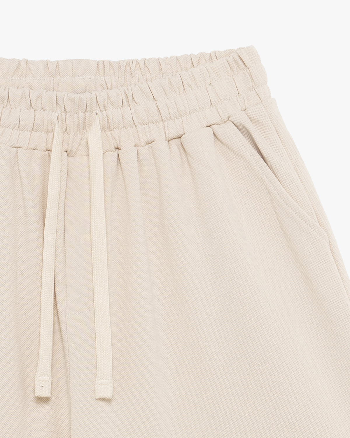 Questi bermuda dal taglio rilassato presentano un design essenziale caratterizzato da una vita elasticizzata con finitura arricciata che assicura il massimo comfort. Il modello è dotato di una coulisse tubolare regolabile inserita frontalmente e di tasche laterali a filo integrate lungo le cuciture per una linea pulita. Realizzati in un tessuto dalla trama operata e compatta, offrono una silhouette a gamba ampia con orli lineari, risultando ideali per un abbigliamento quotidiano dinamico o per momenti di relax senza rinunciare a uno stile curato.