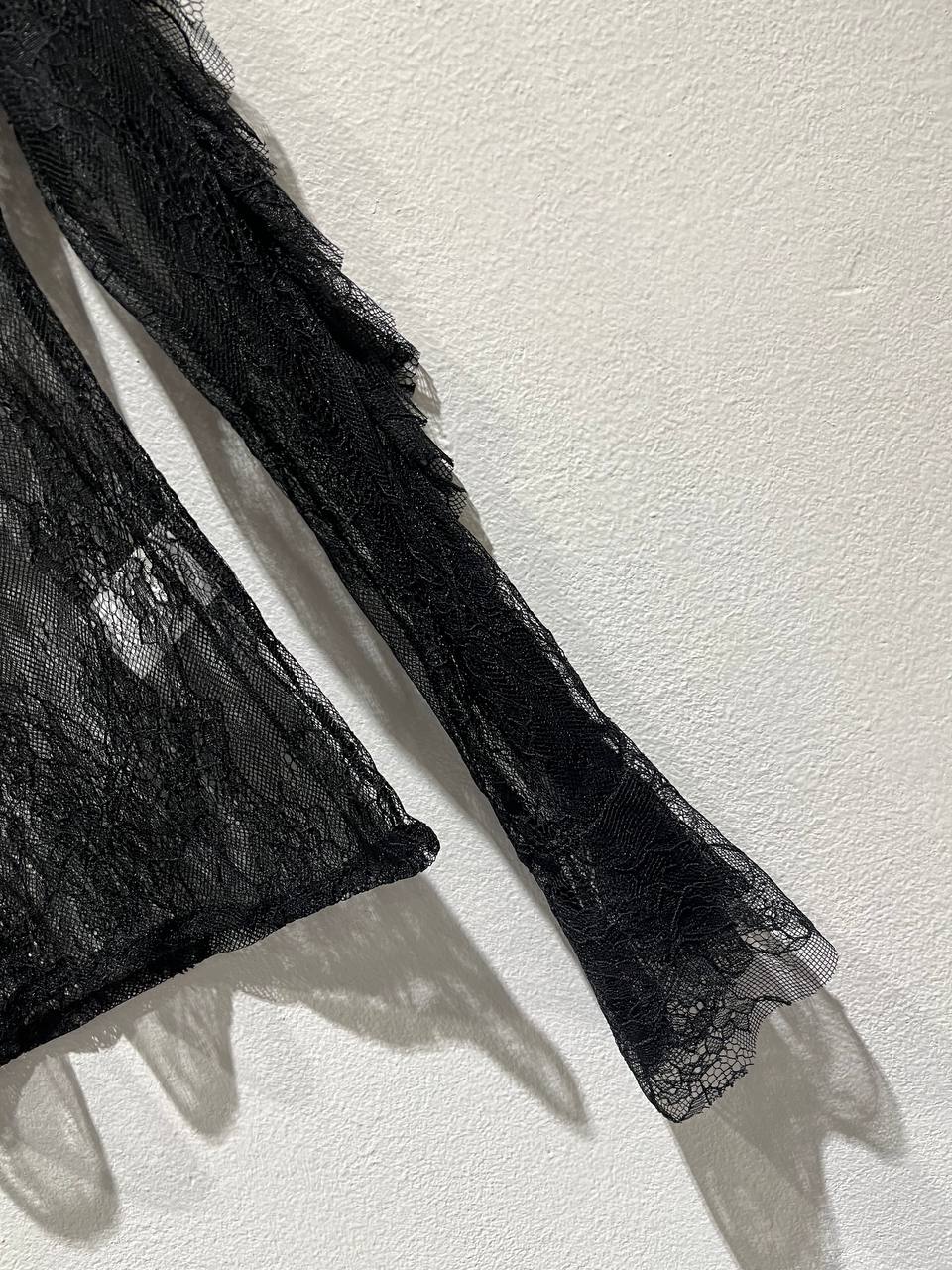 Questa blusa è realizzata interamente in pizzo lavorato con un motivo floreale. Il capo presenta maniche lunghe con volant che si estendono dalla spalla al polso. Lo scollo è rotondo e rifinito. La blusa è trasparente ed è un capo sofisticato per un look elegante o da sera.