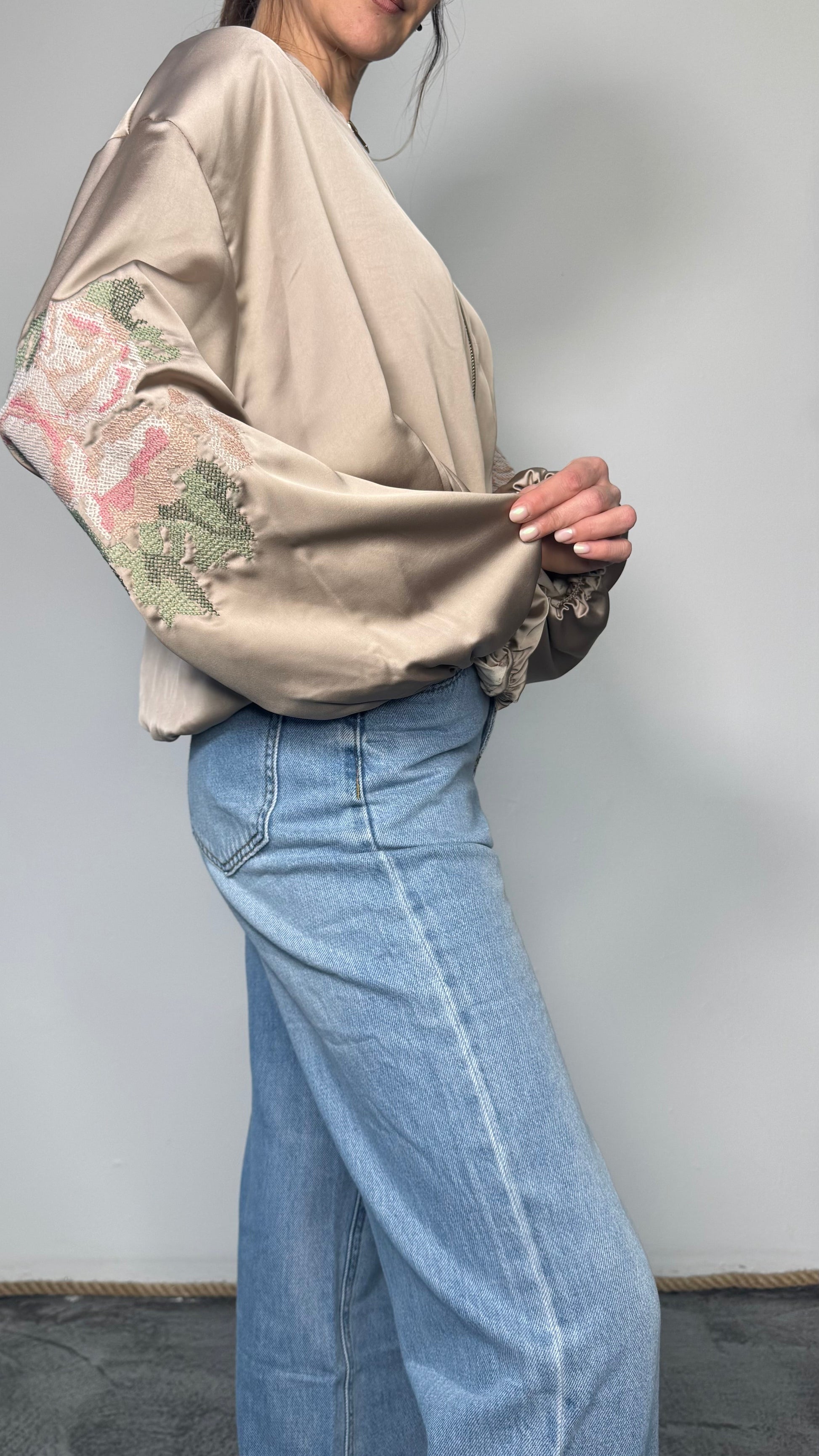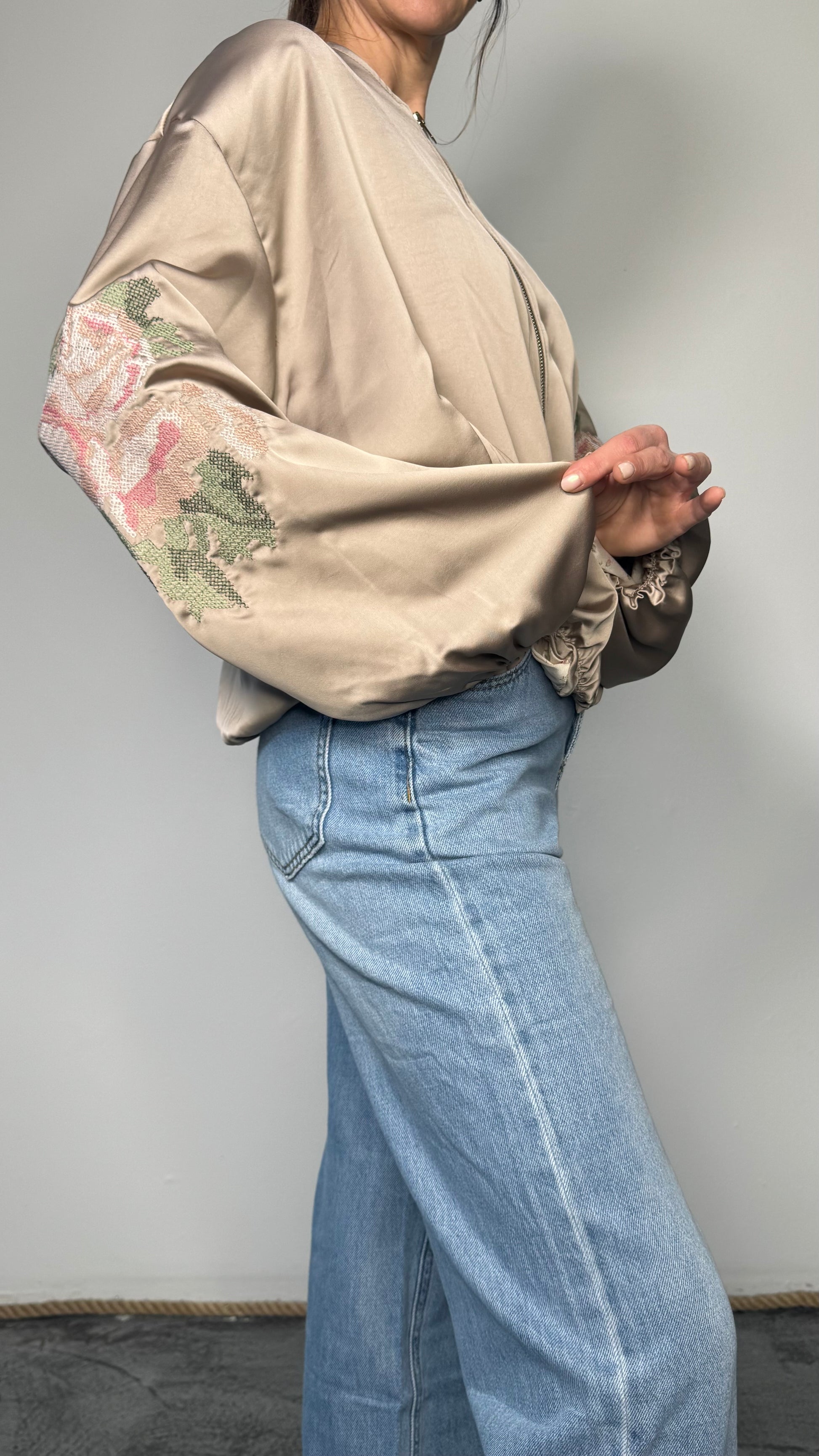 Questa giacca stile bomber è realizzata in un tessuto simil seta dalla finitura lucida che conferisce un aspetto elegante e sofisticato. Il capo è caratterizzato da una chiusura frontale con zip, tasche laterali a filetto e maniche ampie rifinite con elaborati ricami floreali sulle braccia. Il design è completato da bordi elasticizzati che definiscono la silhouette, rendendola una scelta ideale per chi cerca un capospalla leggero capace di unire l'estetica sportiva a dettagli ricercati e femminili.