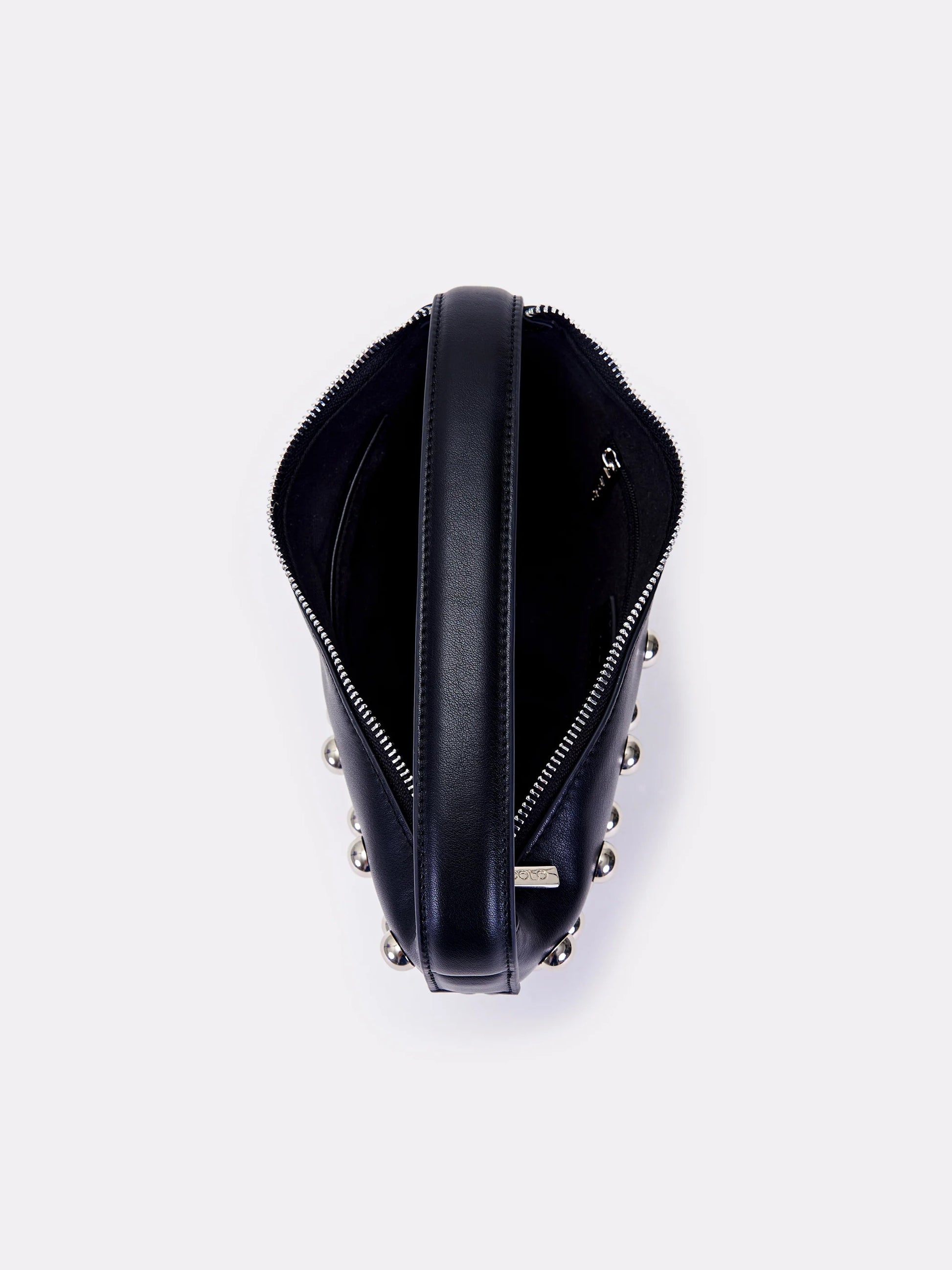 Borsa Croissant a mano in ecopelle con borchie in metallo lucido applicate. Chiusura con cerniera. Dettaglio logo Vicolo laserato. Finiture anticate color argento. Tasca interna con cerniera e taschina piatta.
