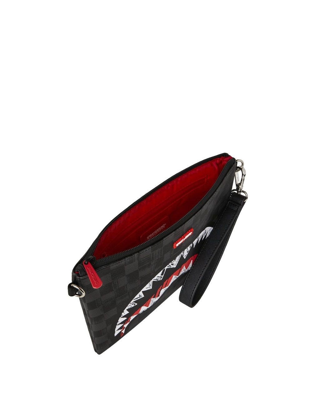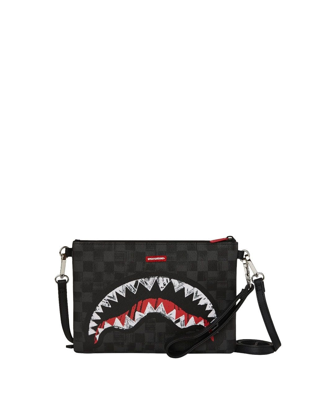 Borsello Uomo in tessuto tecnico, stile flat con motivo a scacchi e iconica stampa shark in contrasto, interno foderato con zip interna e da polsiera applicata esternamente, pratica tracolla regolabile rimovibile e chiusura a zip.