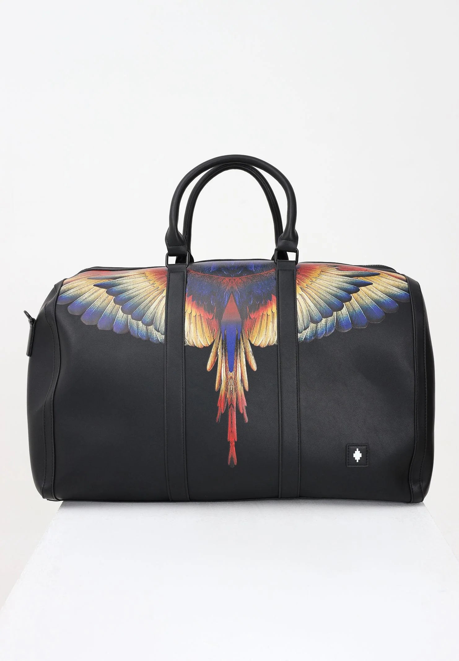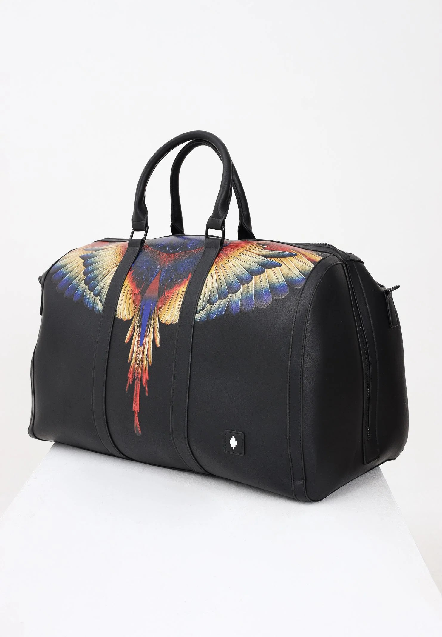 Borsone per uomo e donna. Design in ecopelle, chiusura con zip applicata superiormente, tracolla regolabile e removibile, manici superiori, piedini metallici applicati sul fondo, patch logata applicata sul fondo e logo wings colorfull stampato frontalmente. Internamente: unico scomparto, tasche a soffietto e tasca con zip.
