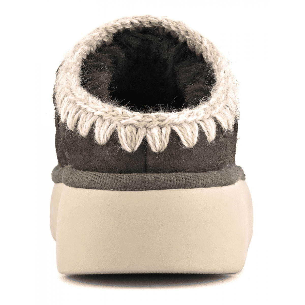 Il bounce clog con logo metallizzato è sapientemente realizzato a mano in vera pelle di montone double-face e dettagli all'uncinetto, distintivi di mou. Il plantare imbottito in pelle e la suola leggera in EVA & gomma rendono questo modello incredibilmente comodo da indossare.