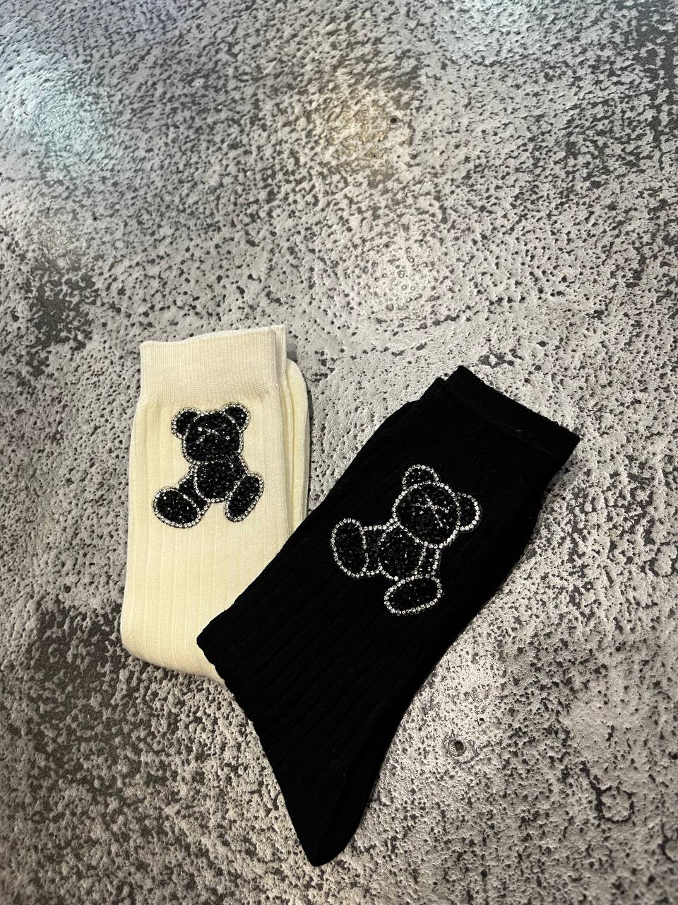 Queste calze presentano una lavorazione a costine e sono impreziosite da un ricamo decorativo a forma di orsetto. Il ricamo è realizzato con piccoli strass o perline lucide, aggiungendo un tocco di brillantezza e un elemento giocoso al capo. Sono un accessorio confortevole e divertente.