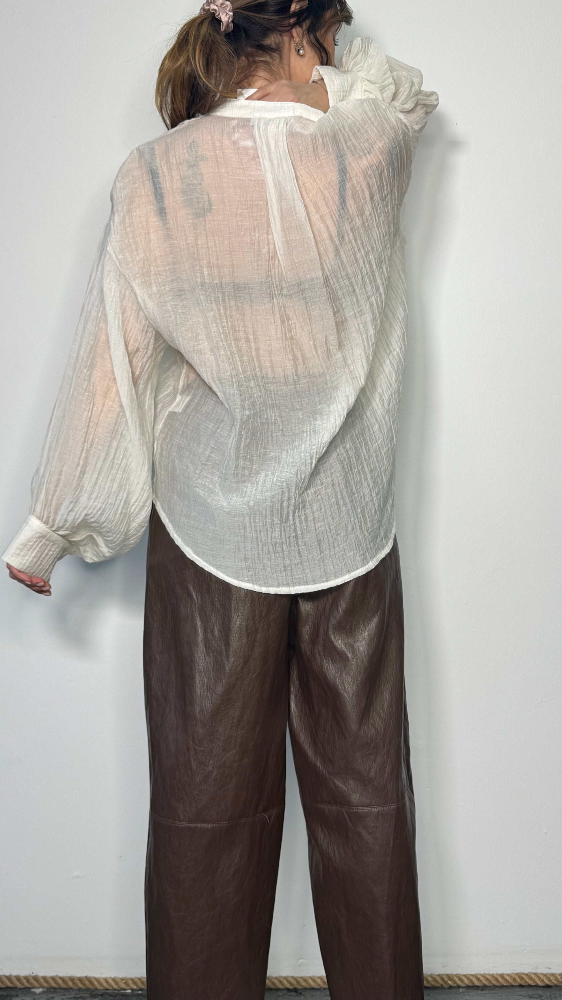 Questa camicia si distingue per la particolare lavorazione plissé del tessuto che crea una texture mossa e sofisticata su tutto il capo. Il modello presenta un raffinato collo alla coreana e una chiusura frontale con bottoni coordinati che percorrono l'intera lunghezza. Caratterizzata da una linea fluida e maniche ampie, è un capo estremamente versatile che unisce comfort e uno stile ricercato, ideale per elevare i look quotidiani o per occasioni più formali.