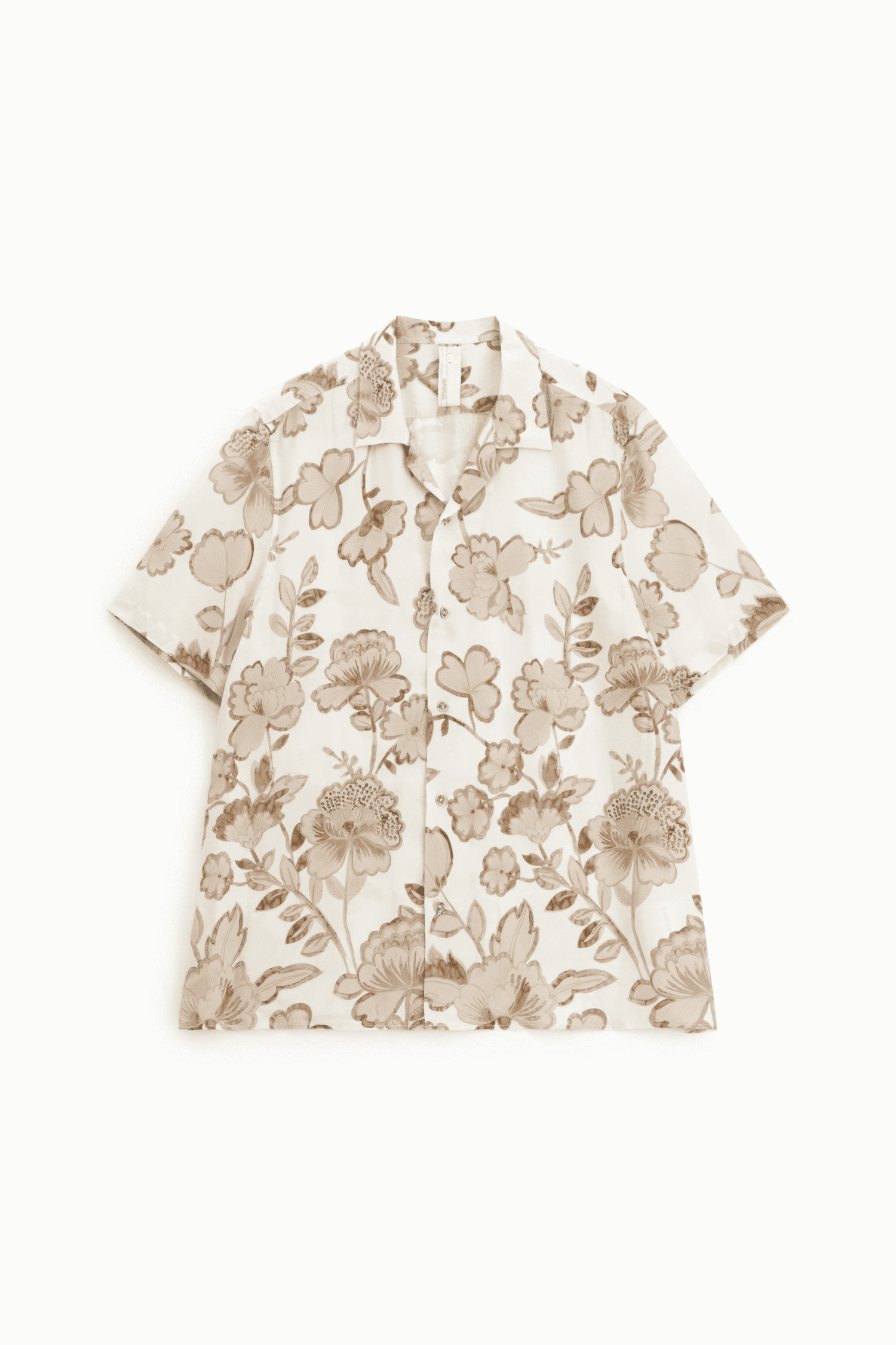Camicia con stampa floreale caratterizzata da collo classico, maniche corte e chiusura con bottoni. La vestibilità rilassata e il motivo esclusivo valorizzano un guardaroba metropolitano versatile, offrendo infinite possibilità di abbinamento per uno stile individuale e distintivo.