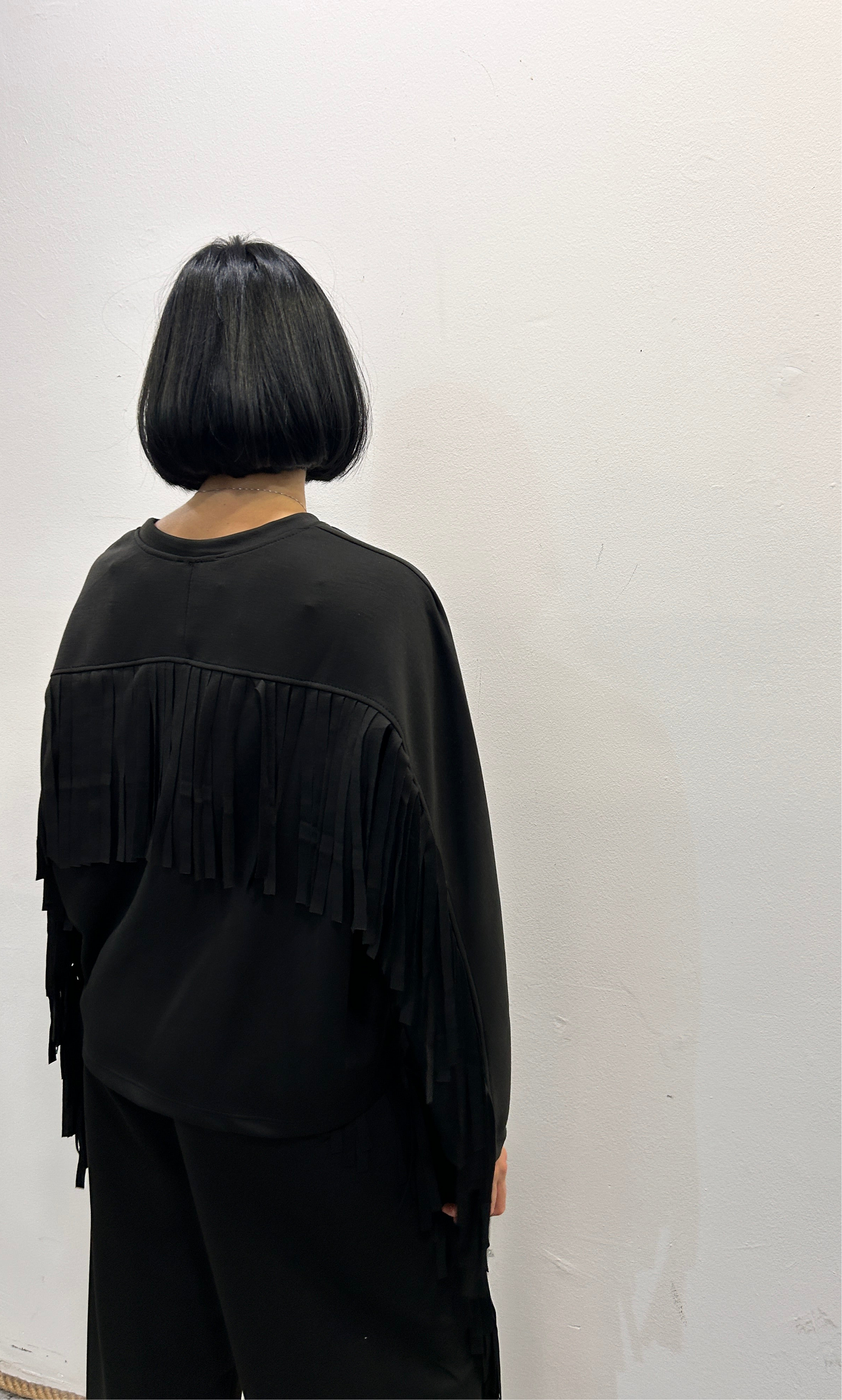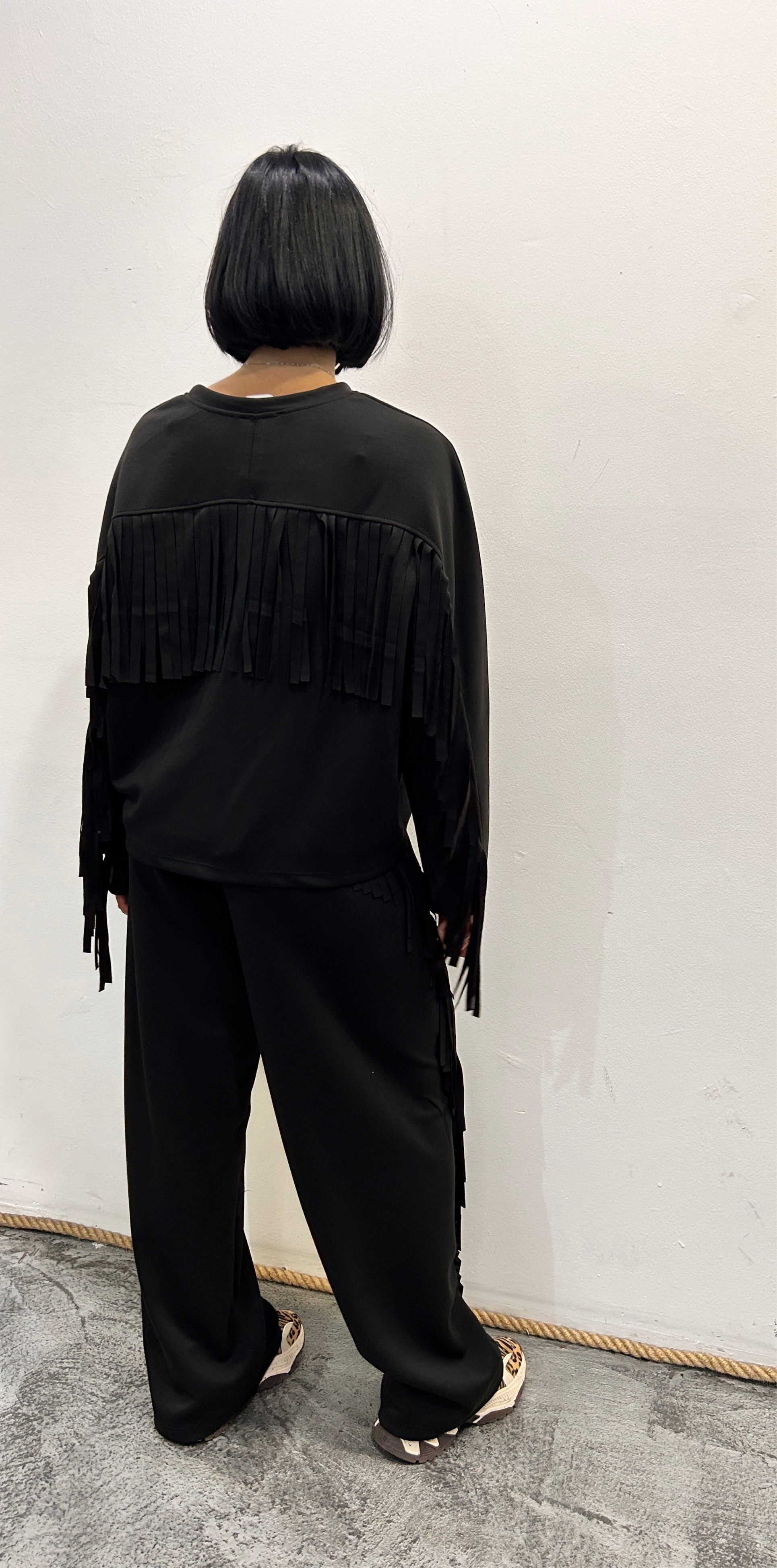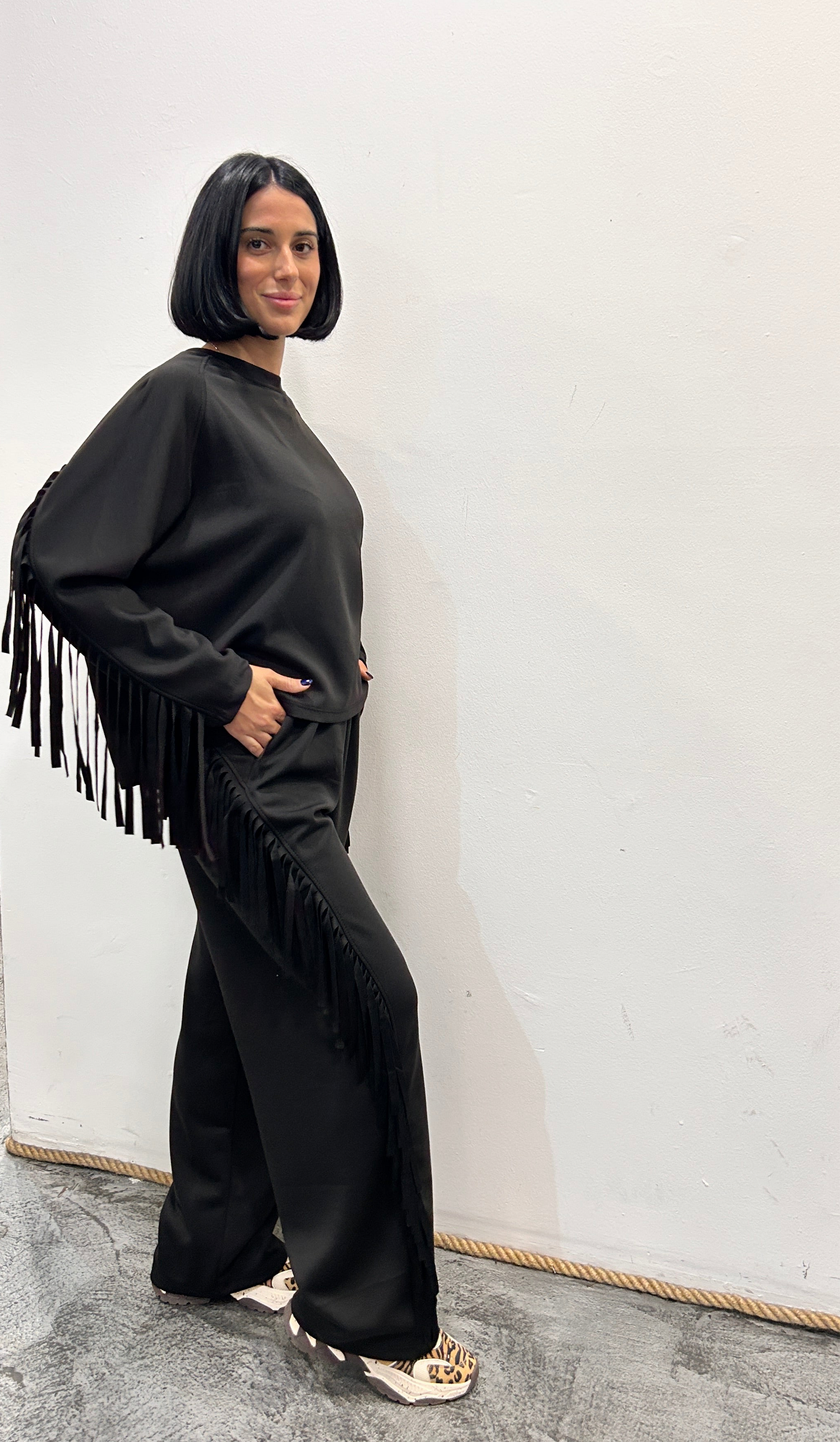 Set due pezzi sporty-chic in tessuto scuba compatto e liscio, che garantisce comfort e vestibilità perfetta. La felpa girocollo e i pantaloni abbinati presentano un dinamico dettaglio a frange lungo i bordi, trasformando un capo casual in un look moderno e d'impatto. Ideale per chi cerca stile e praticità.