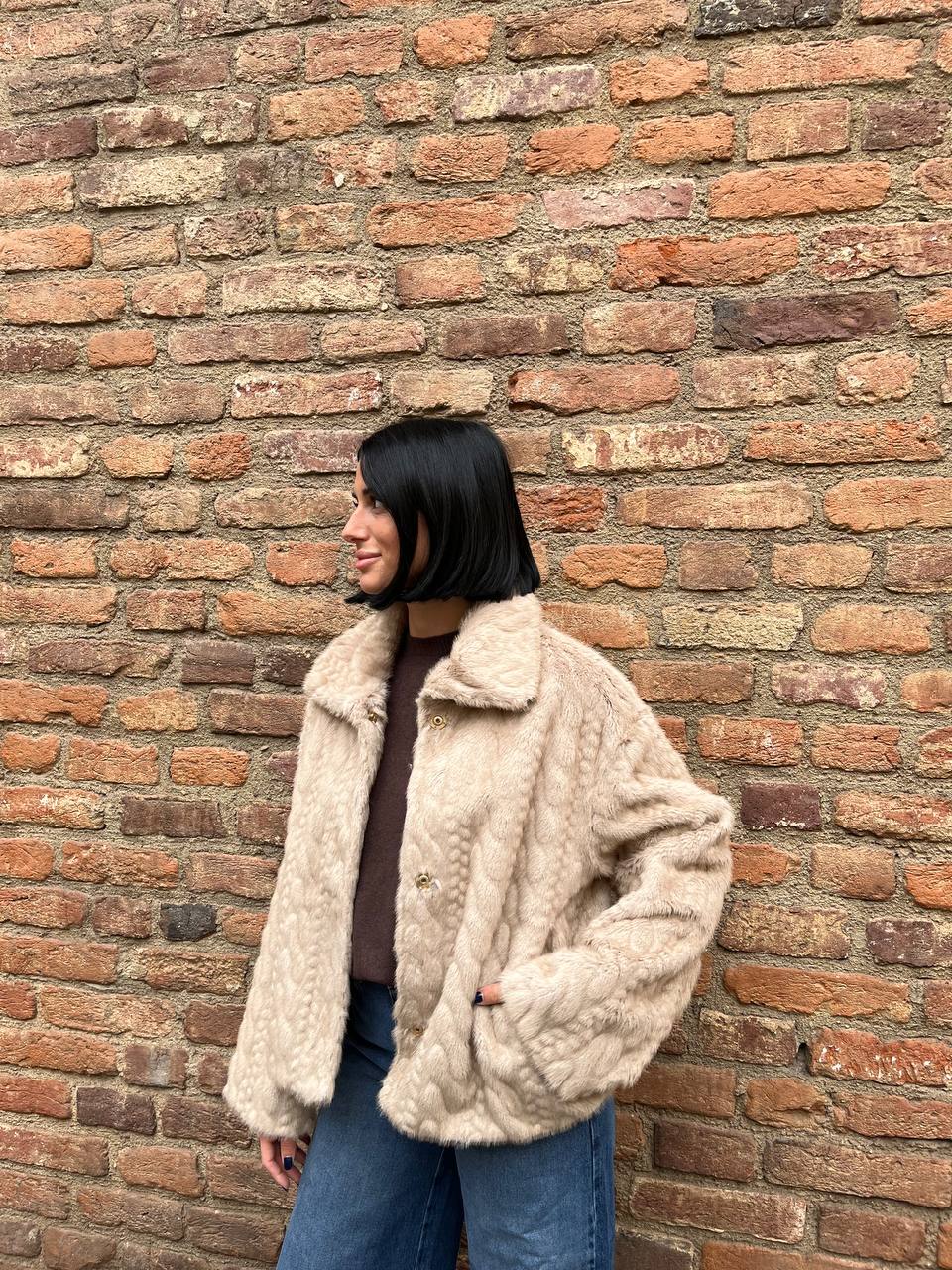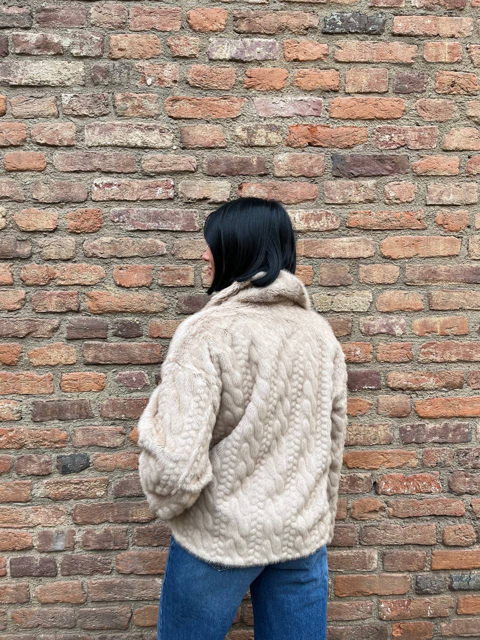 Questa giacca corta è realizzata in morbida ecopelliccia. Presenta un motivo a trecce (o braid) su tutta la superficie e una chiusura con cerniera frontale.