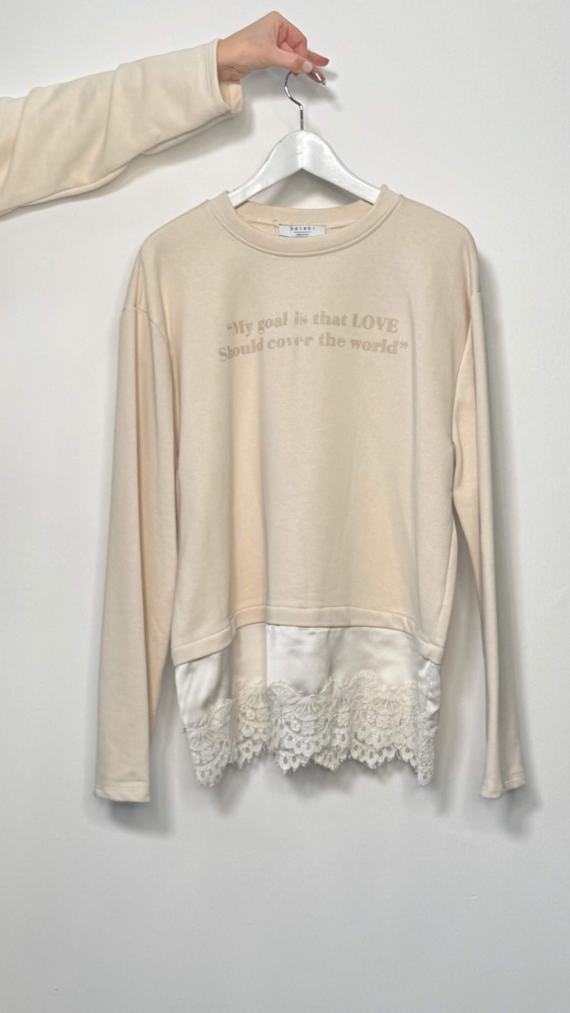 Questa felpa dal taglio morbido si distingue per l'originale applicazione in pizzo ricamato lungo il bordo inferiore che aggiunge un tocco romantico al design sportivo. Il modello presenta un classico scollo rotondo e una stampa frontale con lettering d'ispirazione motivazionale. Realizzata in un tessuto morbido e confortevole, è caratterizzata da maniche lunghe con polsini elastici che la rende ideale per outfit quotidiani femminili e ricercati.