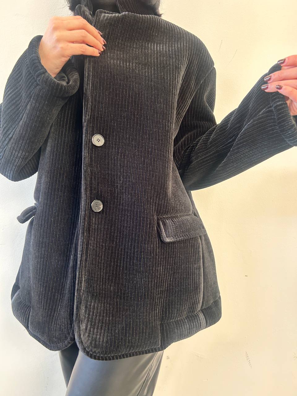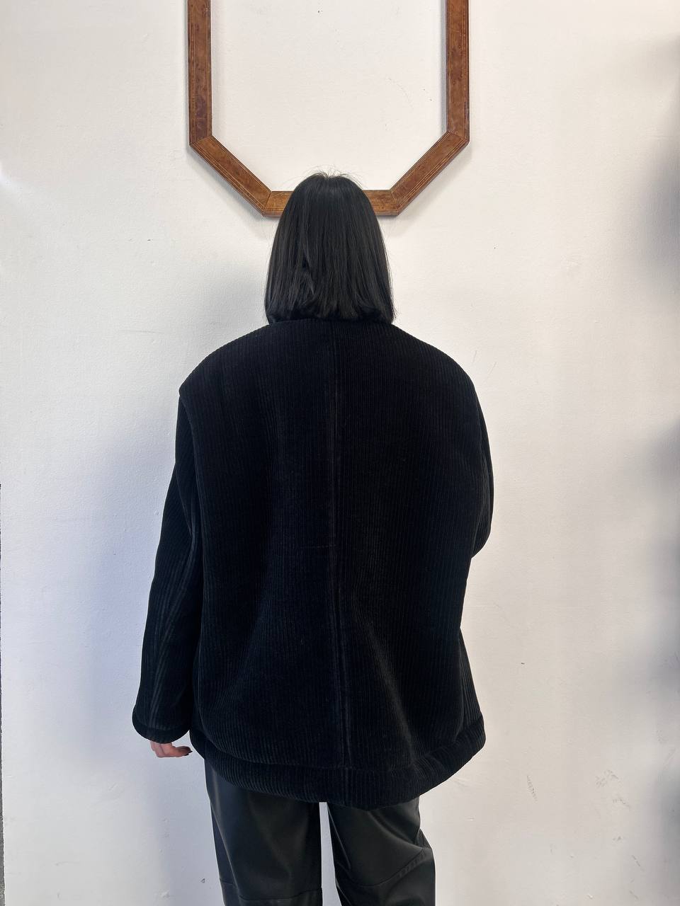 Questa giacca ha un taglio ampio e una vestibilità oversize. Il tessuto è un velluto a costine che le conferisce un aspetto morbido e casual. Presenta un colletto e un'apertura frontale con tasche applicate. All'interno è foderata in orsetto.
