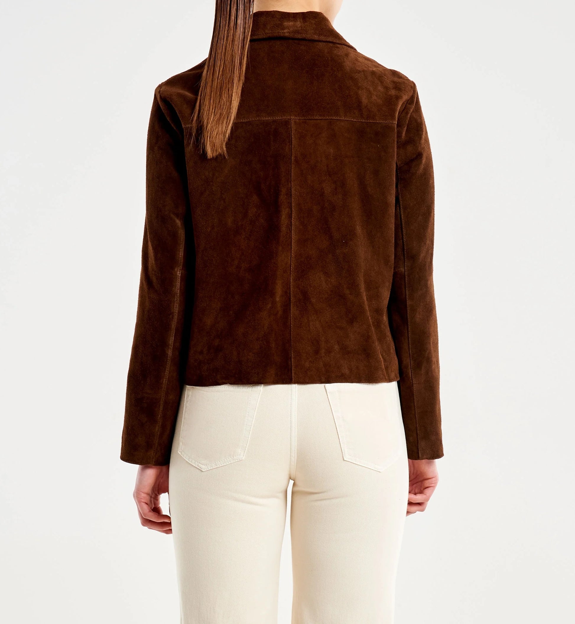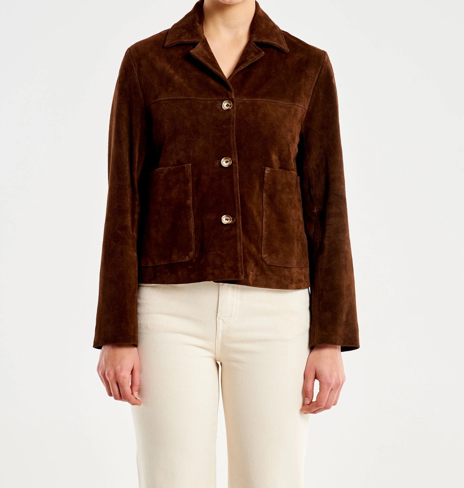 Giacca corta in pelle scamosciata con maniche lunghe e colletto a revers. Tasche frontali applicate. Chiusura con bottoni. Dettaglio cuciture visibili.