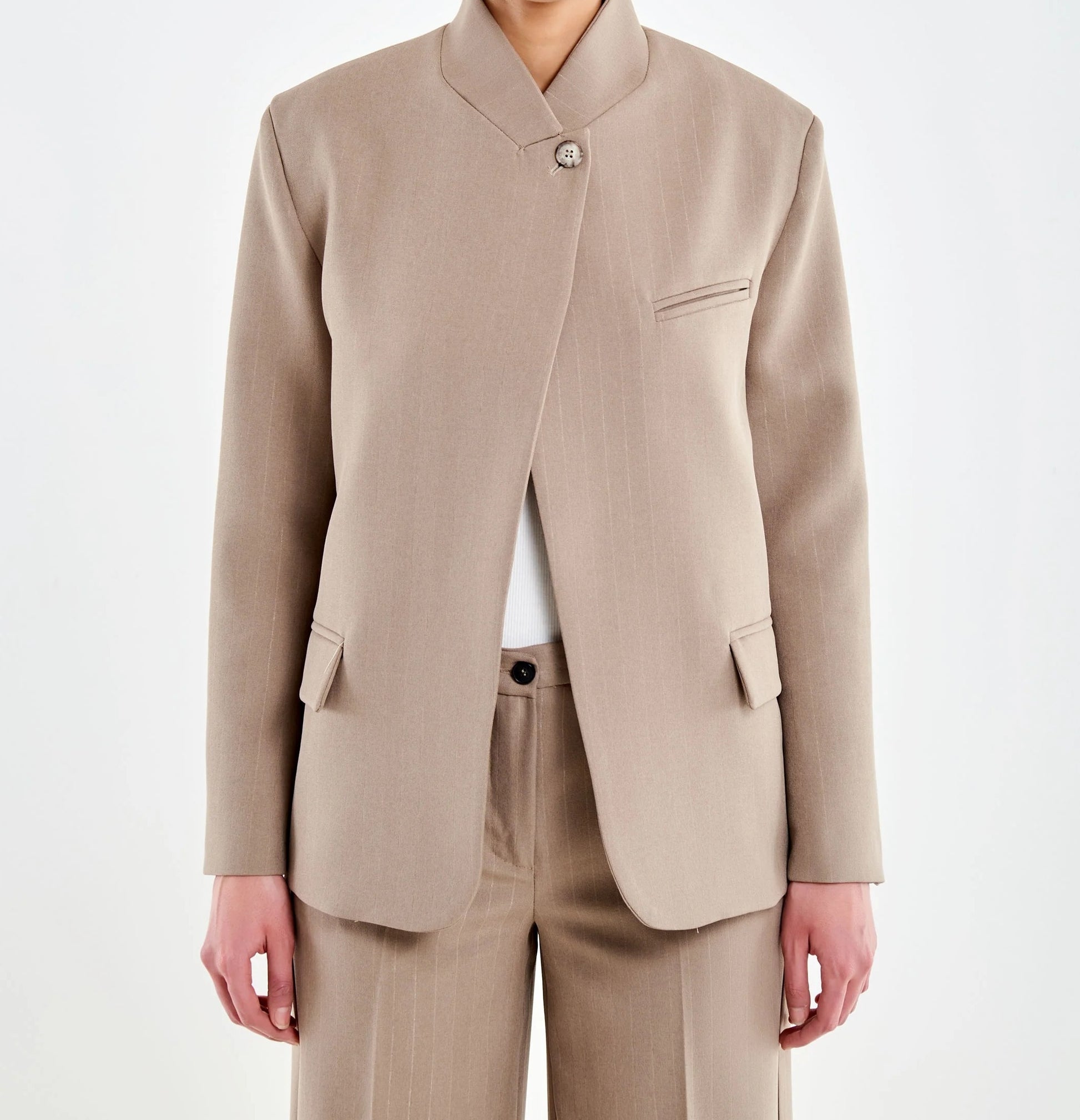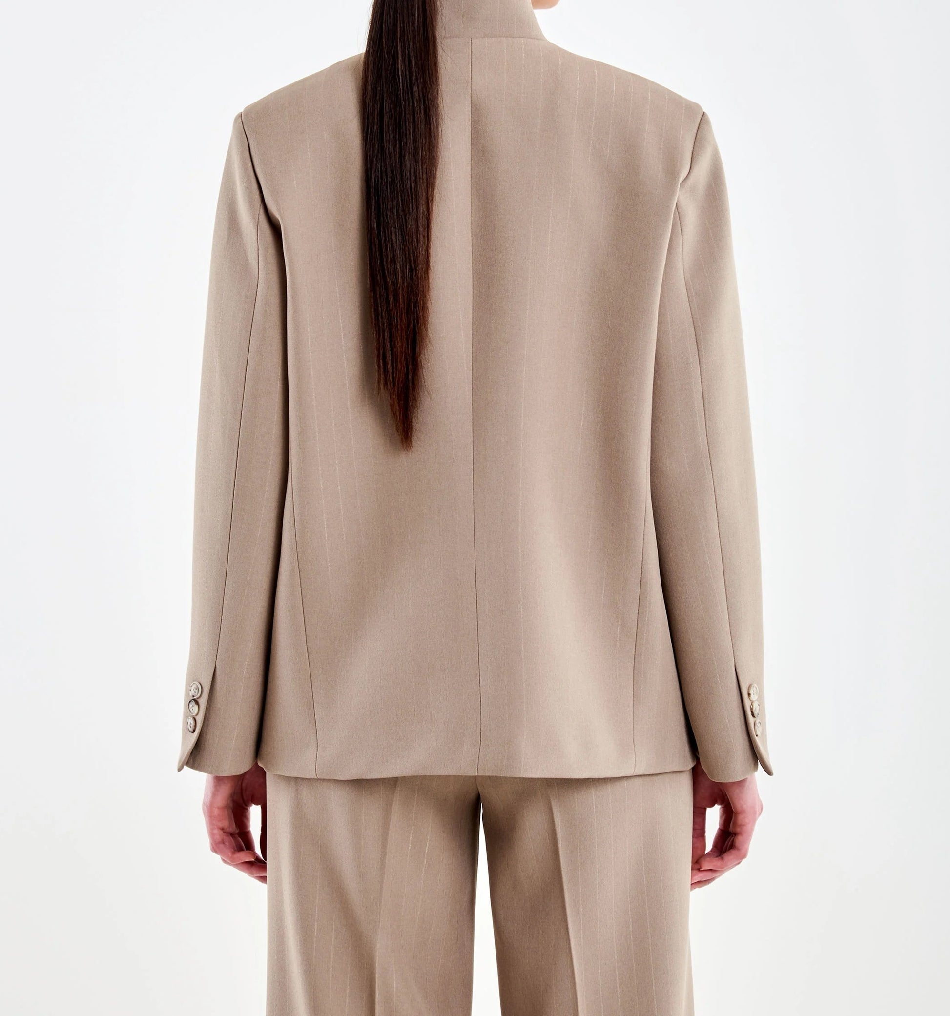 Blazer a collo alto maniche lunghe con spacco frontale. Chiusura con un bottone tartarugato alto. Tasche a filetto sul petto e tasche a pattina frontali. Dettaglio tessuto gessato.
