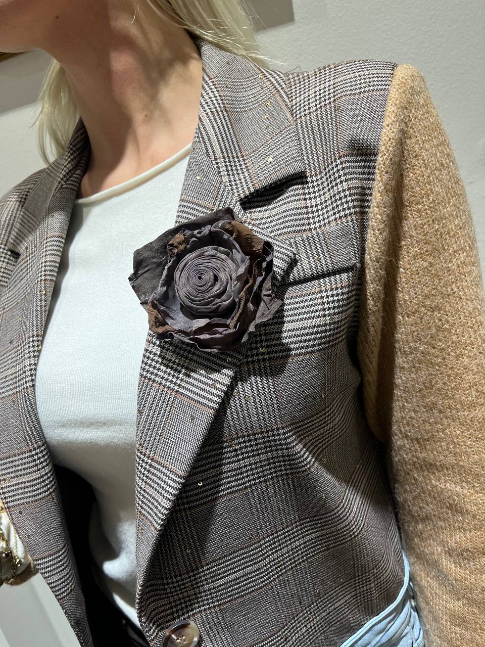 Questa giacca unica unisce il classico motivo a quadri a un design moderno e asimmetrico. La parte principale della giacca, con una stampa check, è realizzata in una miscela di materiali. A contrasto, le maniche presentano un tessuto in maglia morbida. I dettagli aggiungono un tocco di eleganza: una chiusura con un solo bottone e una spilla a fiore in tessuto applicata sul revers.