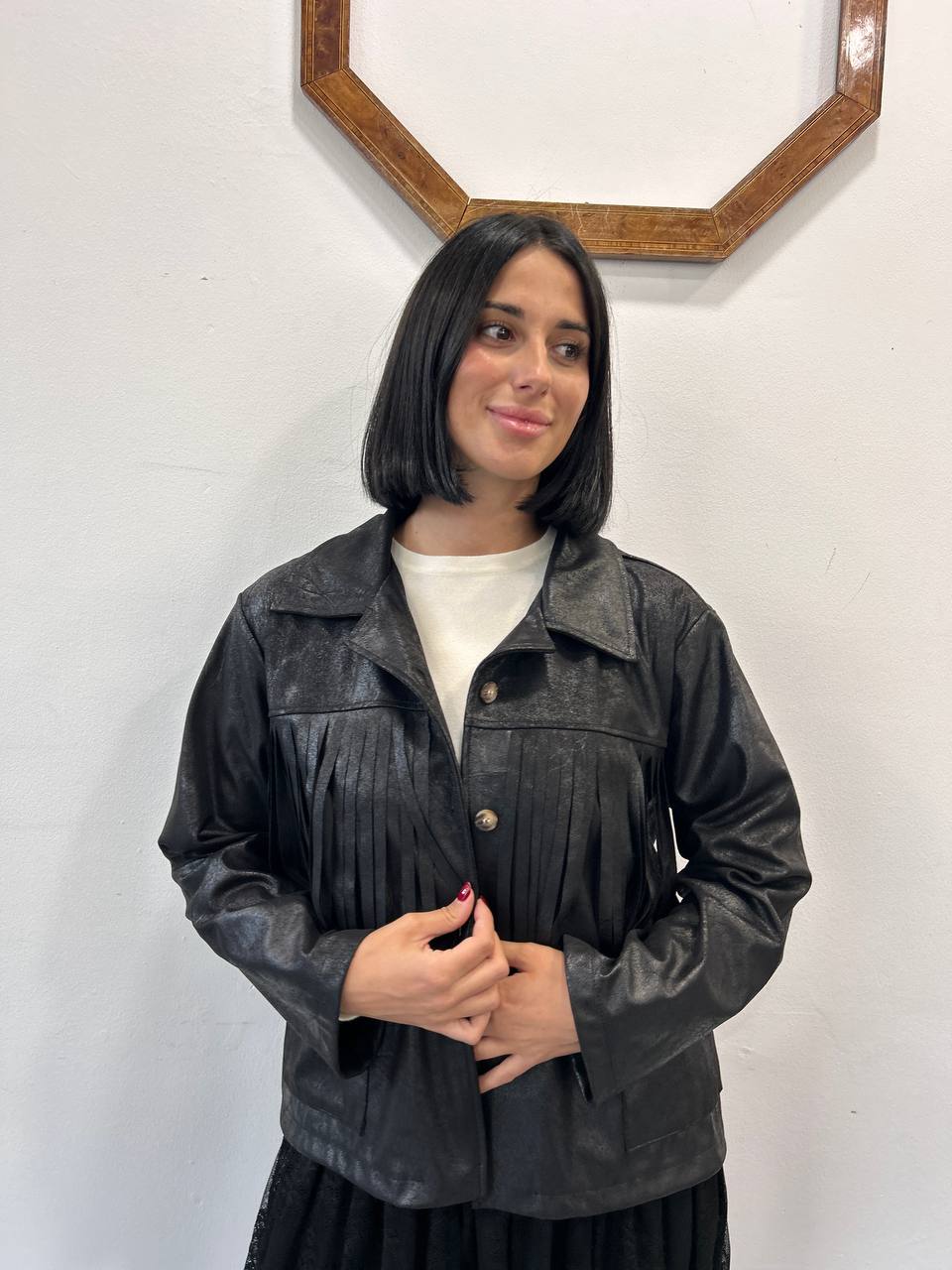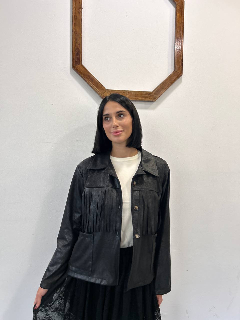 Questa giacca ha una vestibilità comoda e un design in stile western. Il capo è impreziosito da lunghe frange che decorano il petto. Realizzata in un tessuto che sembra similpelle morbida o scamosciato, è l'ideale per un look di carattere.