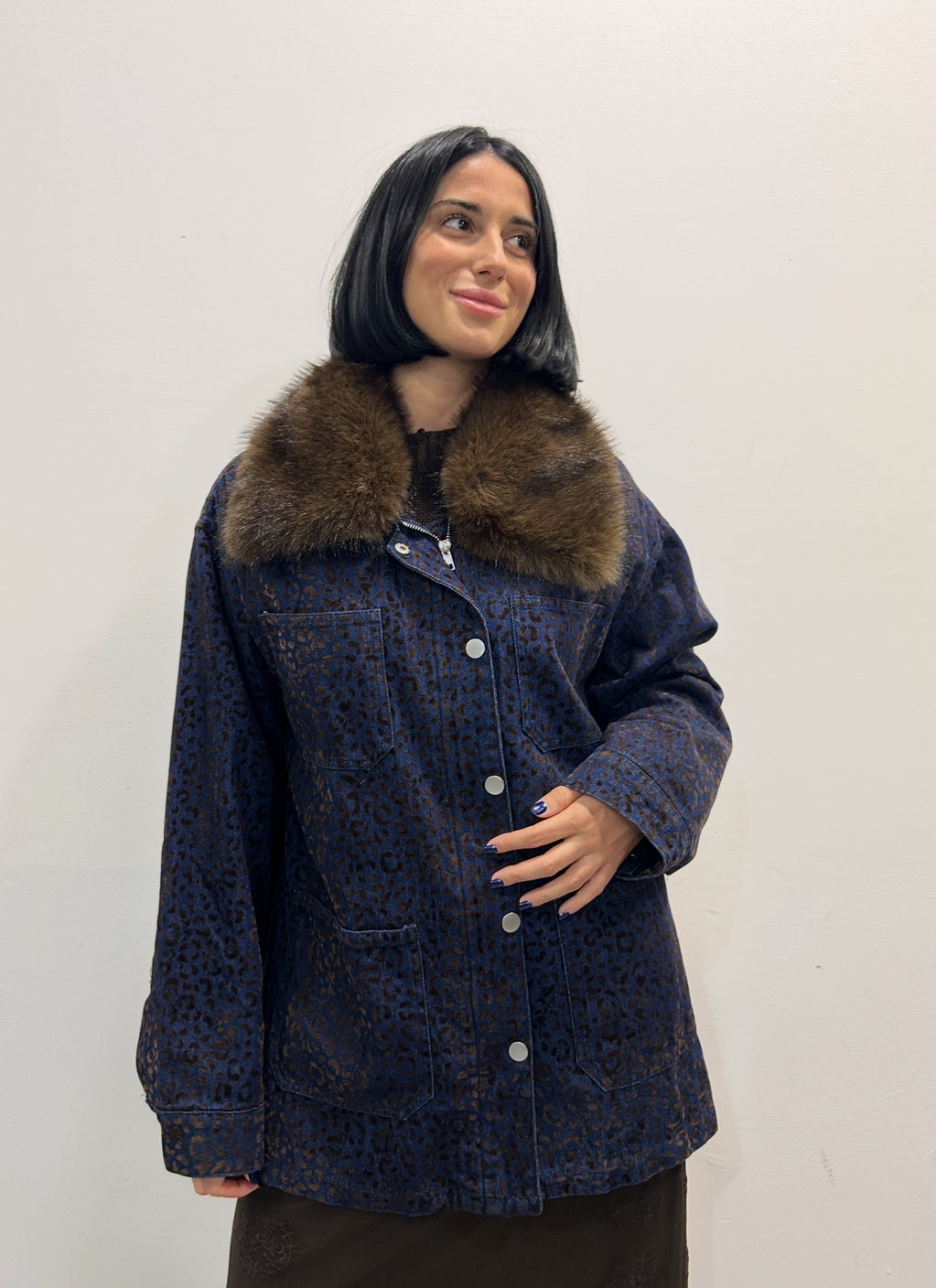 Giacca dalla vestibilità ampia e oversize con un design audace ma elegante. Il tessuto esterno presenta una sottile fantasia animalier all-over. Il capo è rifinito con un ampio e voluminoso collo in pelliccia ecologica a contrasto, che aggiunge calore e lusso. La chiusura è frontale con bottoni chiari. Ideale come capospalla versatile, unisce comfort e un tocco distintivo di glamour.