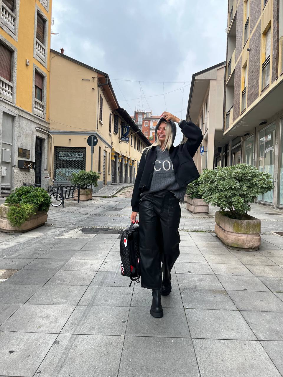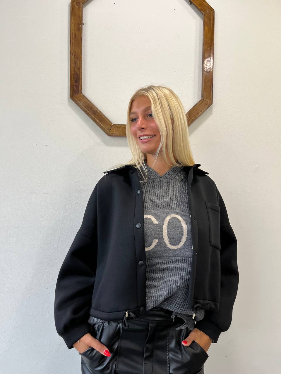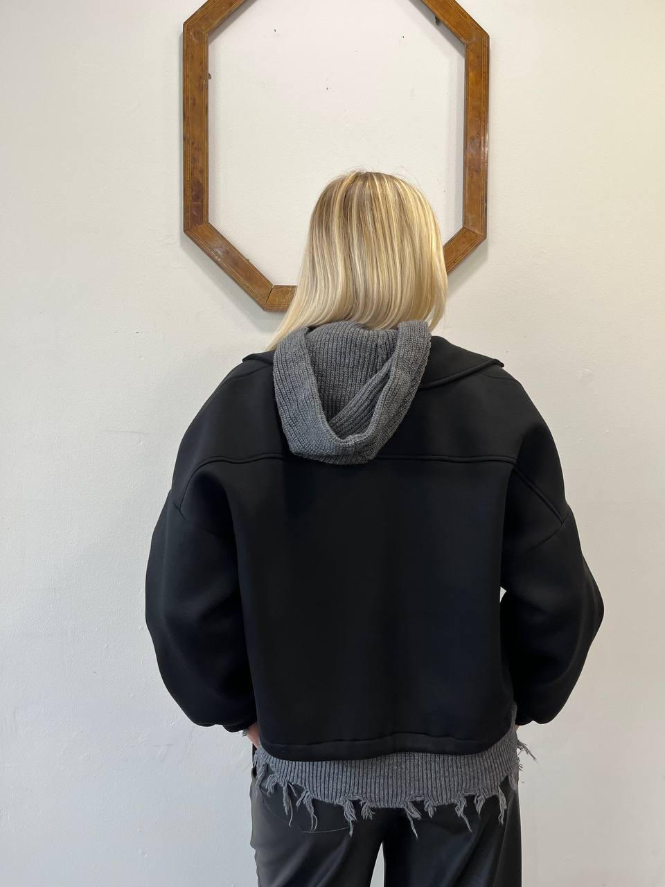 Giacca corta dal design moderno e versatile, ideale per aggiungere un tocco casual ai tuoi outfit. La giacca esterna, in un morbido tessuto tecnico, presenta un colletto alto e una chiusura con bottoni, mentre l'inserto interno in maglia grigia con cappuccio completa il look e offre un maggiore comfort.