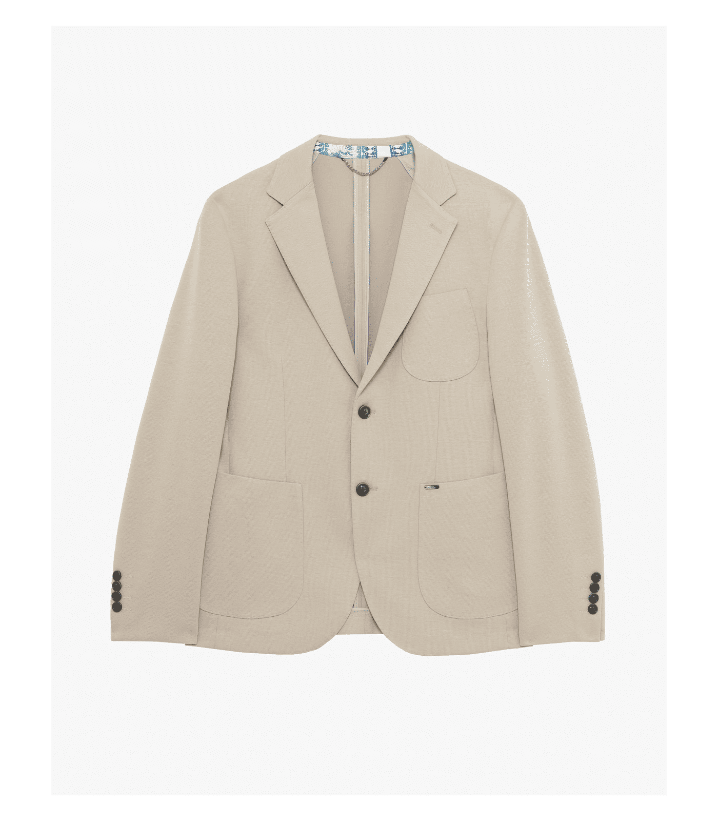Giacca da uomo in interlock di misto poliestere e cotone, modello blazer destrutturato sfoderato, monopetto a due bottoni con revers classici impunturati tono su tono, spilla all'asola, tasca sul petto e tasche anteriori applicate con micro placchetta logo cucita su un lato e spacchetti posteriori