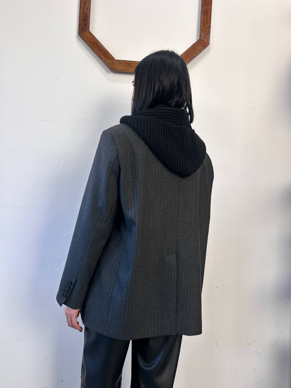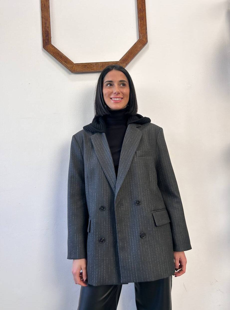 Questo blazer presenta un design doppiopetto con una chiusura frontale. Il tessuto è caratterizzato da una fantasia gessata verticale. Il capo include un cappuccio in maglia integrato nel colletto rimovibile, offrendo un look a strati.