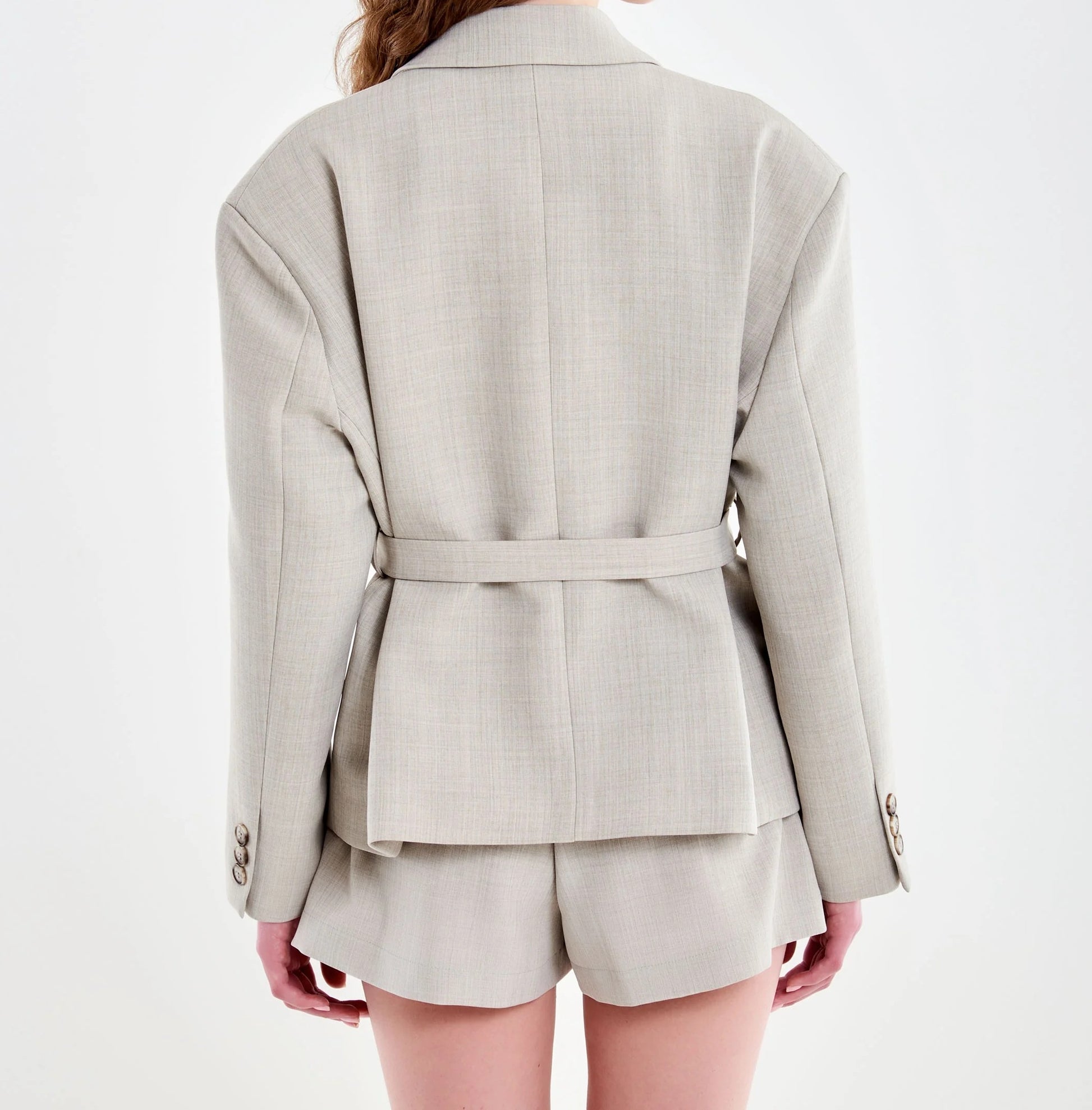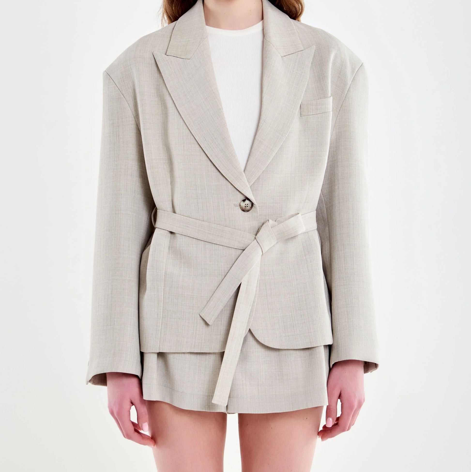 Blazer over modello cropped, maniche lunghe, con revers. Chiusura con laccio in vita. Tasca frontale sul petto a filetto. Dettaglio bottoni sui polsi