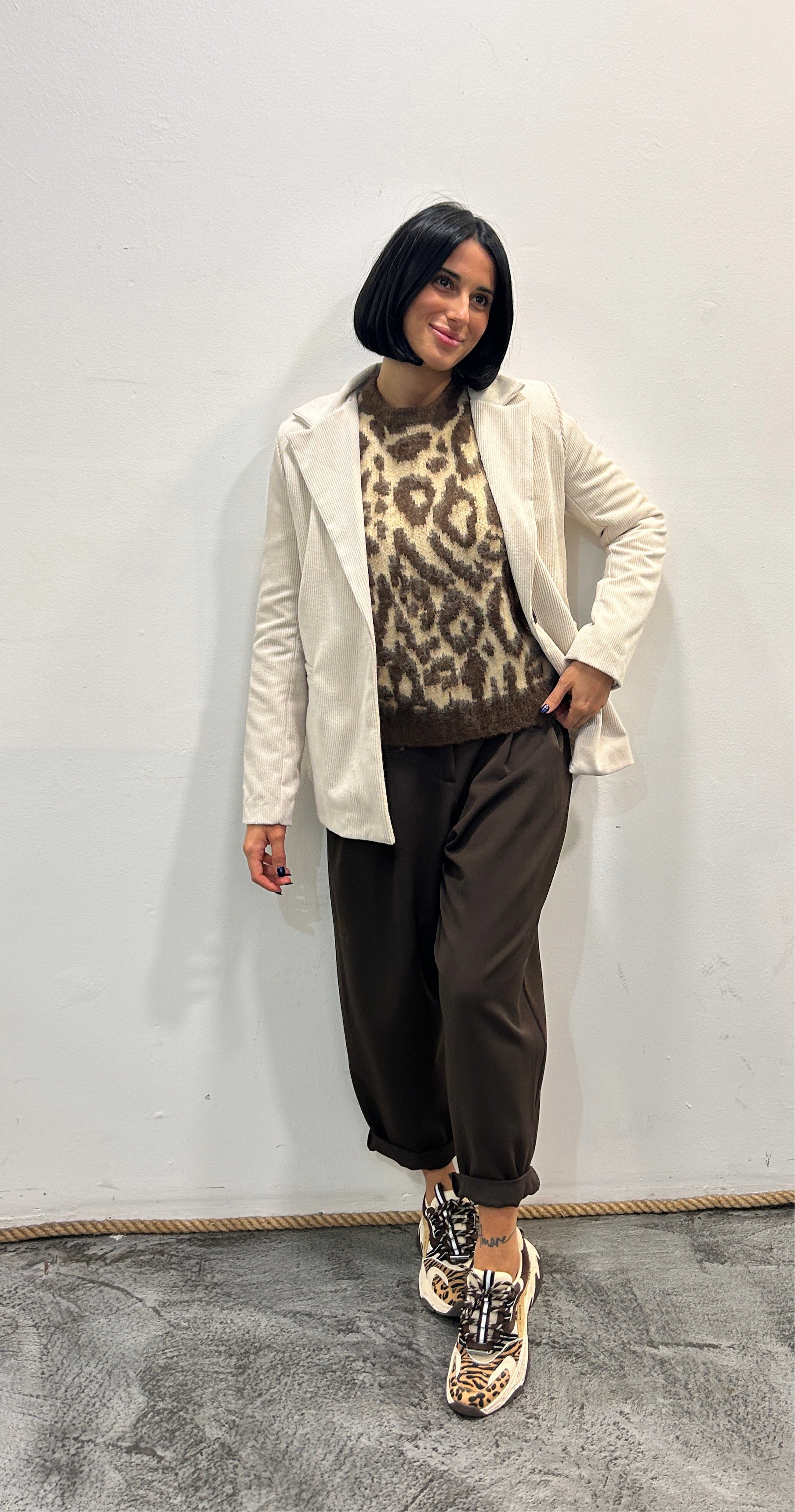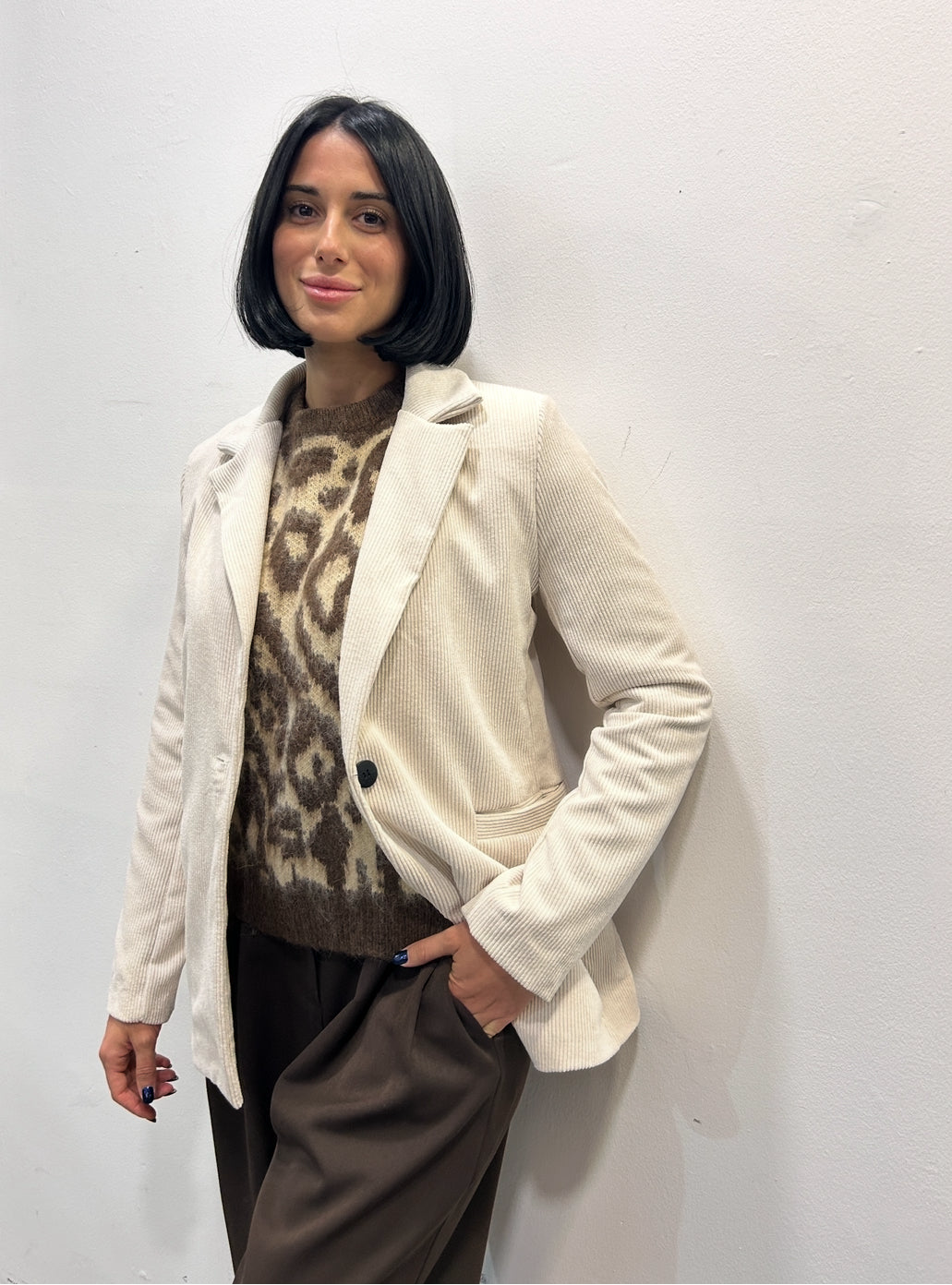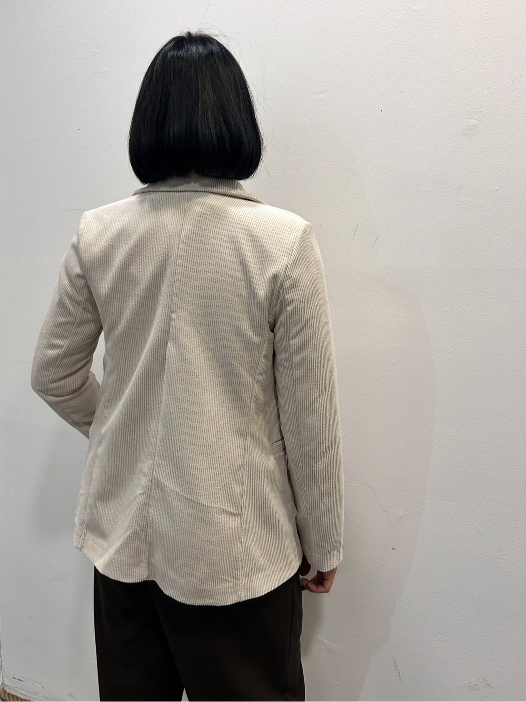 Giacca blazer monopetto realizzata in morbido e strutturato velluto a coste. Questo capo presenta un design classico con revers a punta e una chiusura a un solo bottone. La vestibilità è dritta e versatile, adatta a creare look sia formali che casual-chic. È dotata di tasche applicate a filetto e di una fodera interna. Un classico intramontabile, perfetto per la stagione autunnale e invernale.