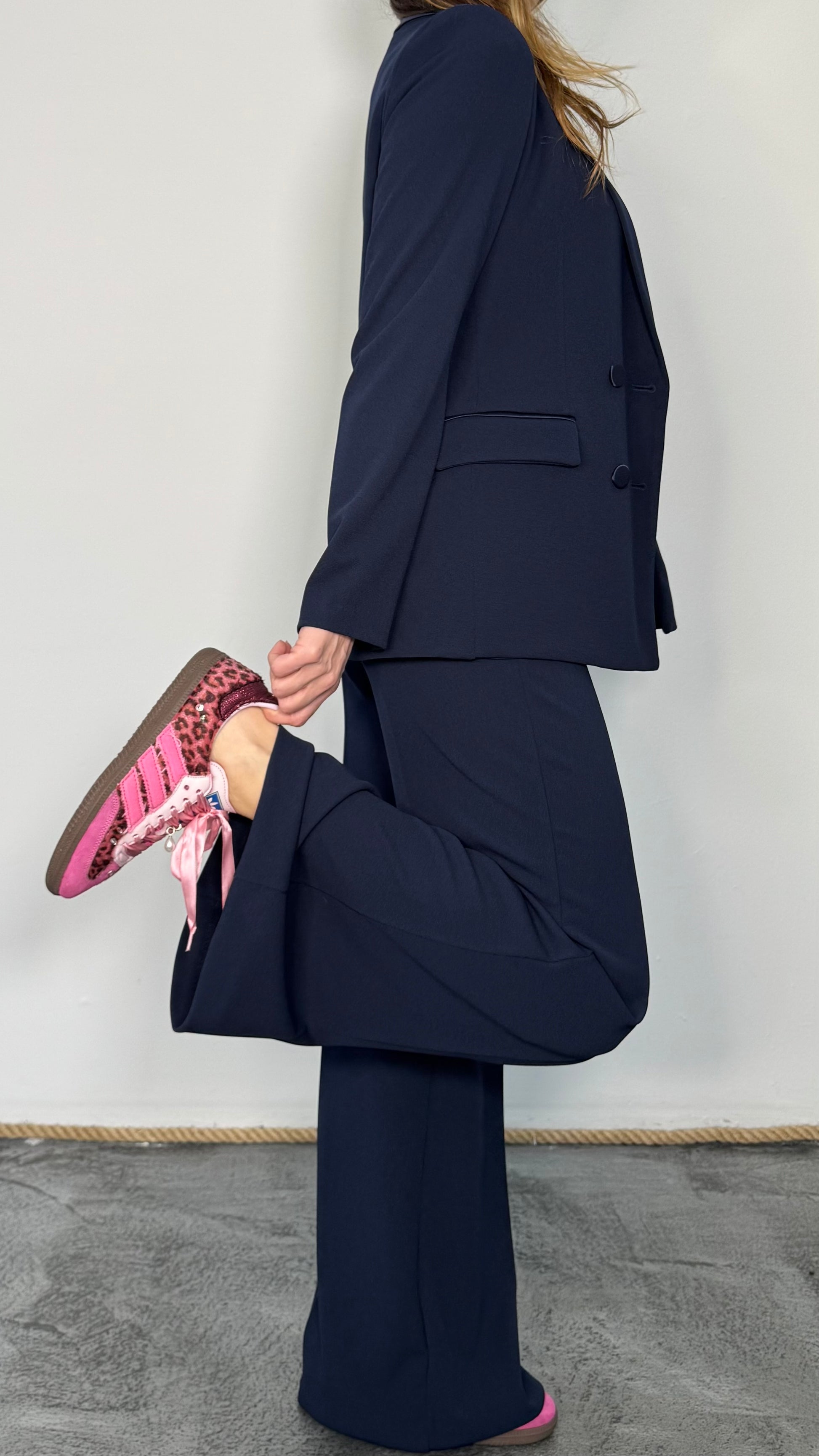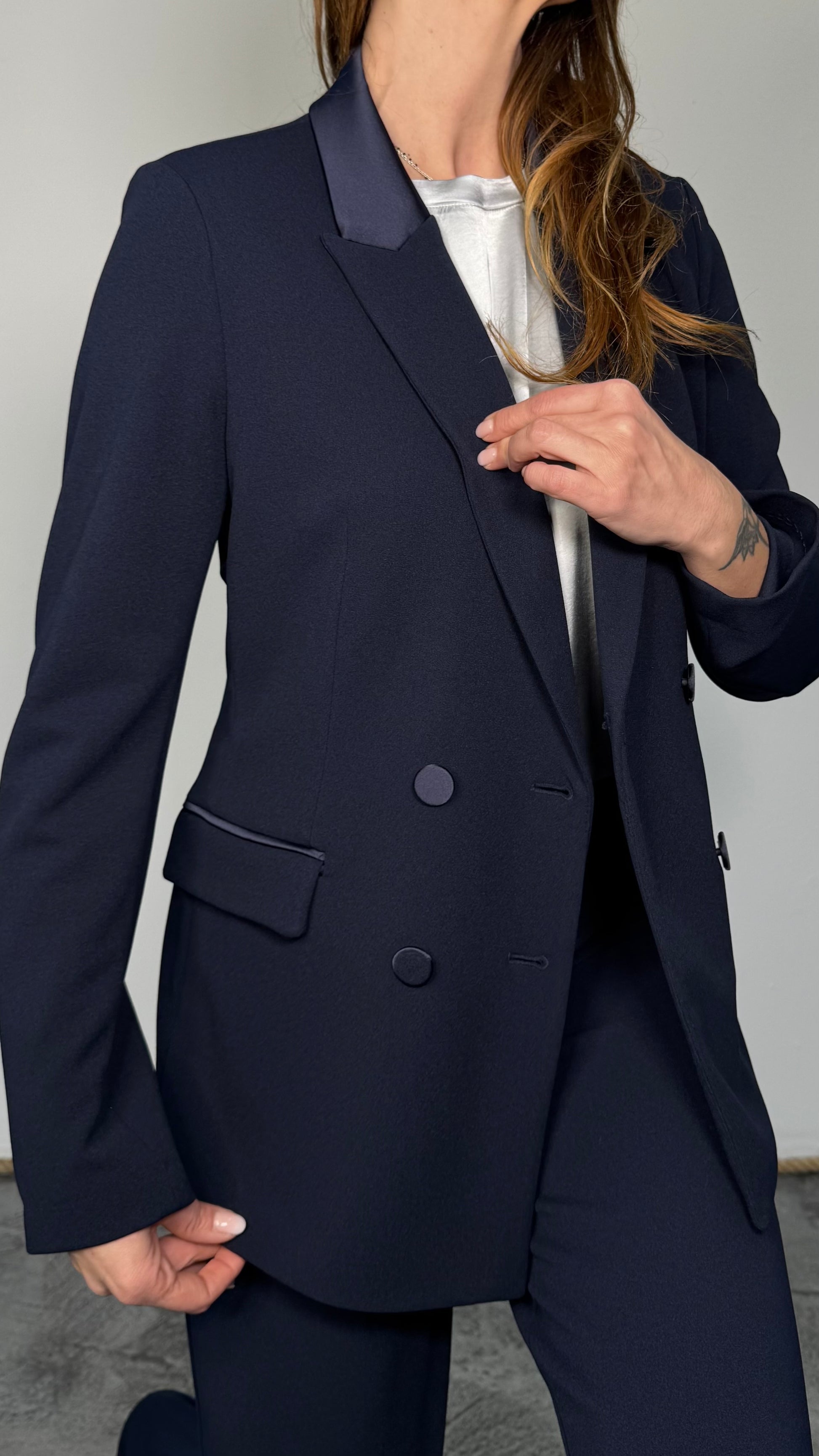 Giacca doppiopetto con chiusura con bottoni in raso, colletto in raso e tasche con patta