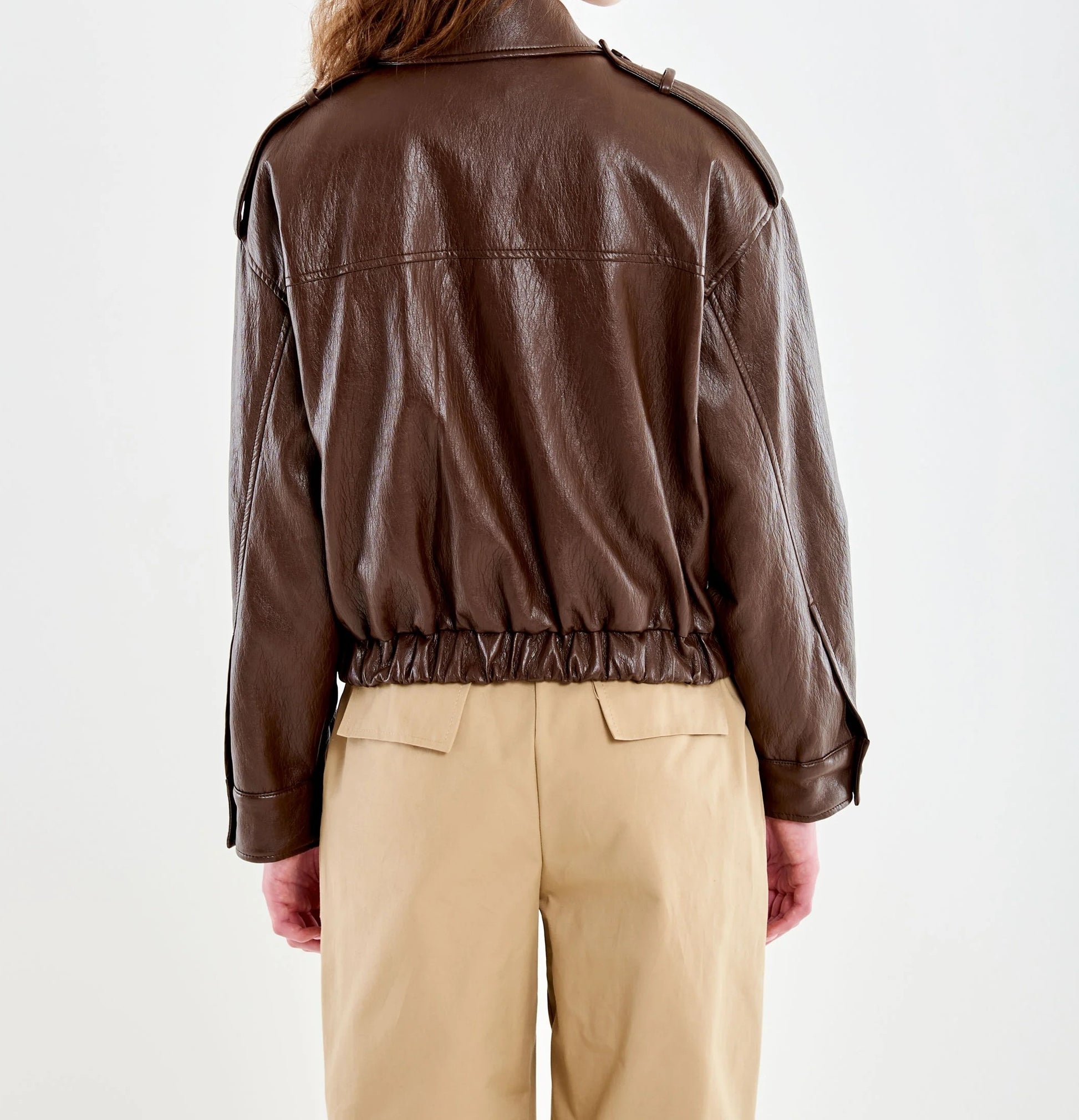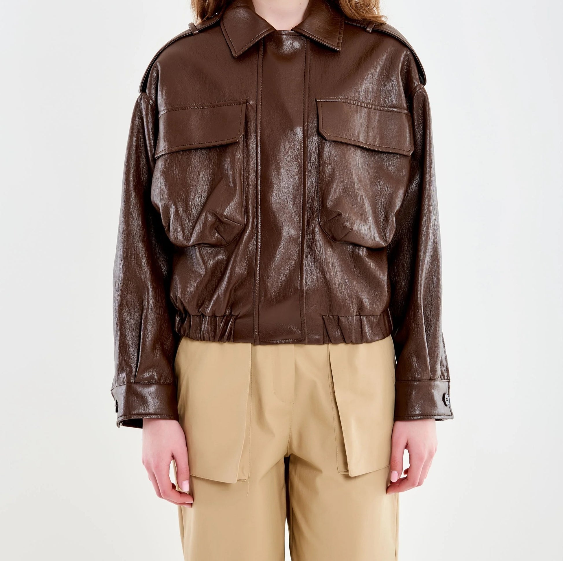 Bomber corto con colletto e maniche lunghe. Chiusura frontale con cerniera e bottoni a pressione. Con arriccio sul fondo. Tascone frontali con pattina e alamari sulle spalle. Dettaglio ecopelle effetto stropicciata.