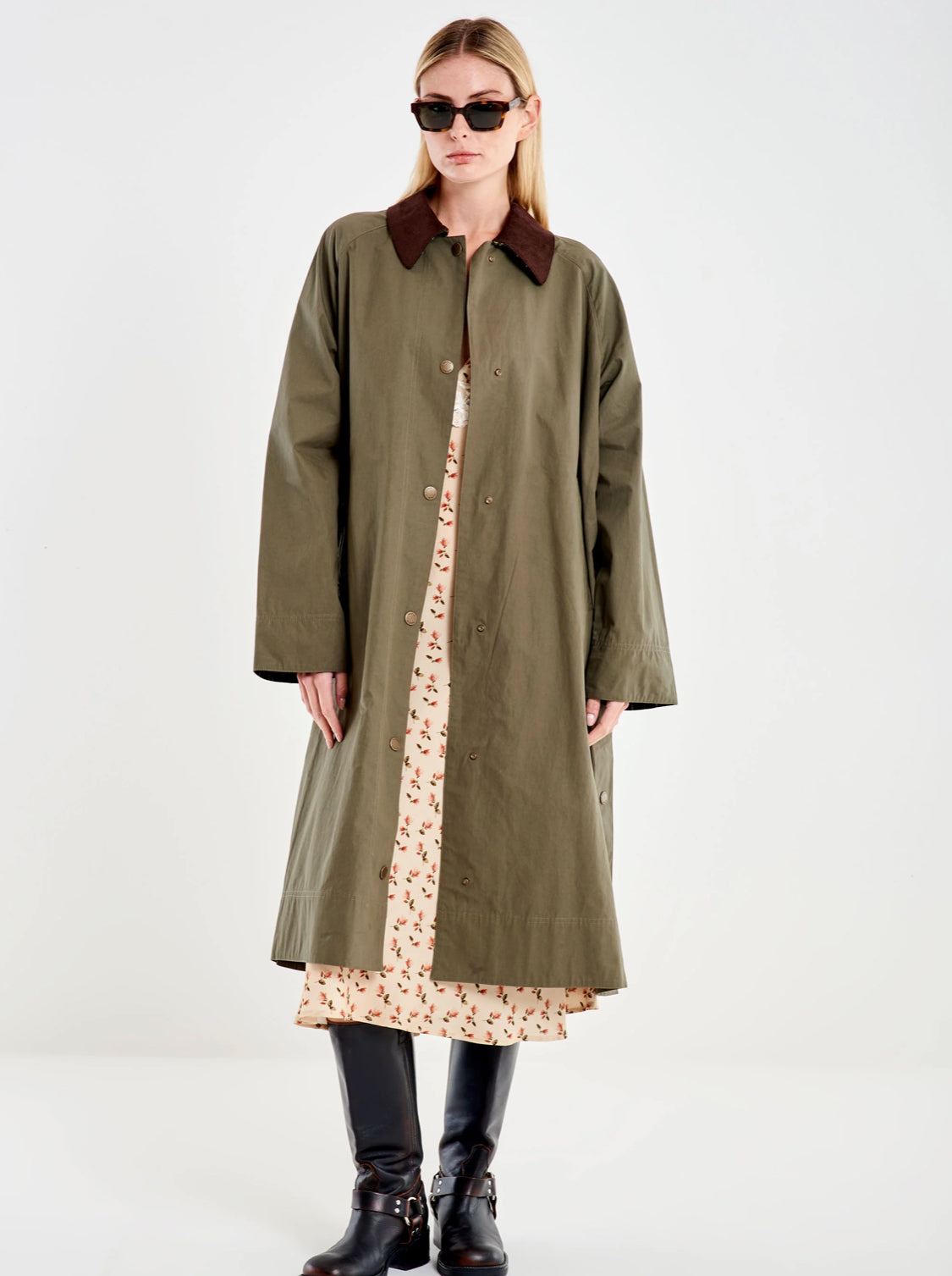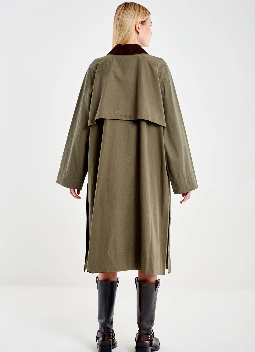 Trench lungo oversize con colletto a contrasto. A maniche lunghe, chiusura con bottoncini a pressione. Tasche laterali a filetto. Dettaglio spacchi laterali con possibilità di chiusura con bottoni.