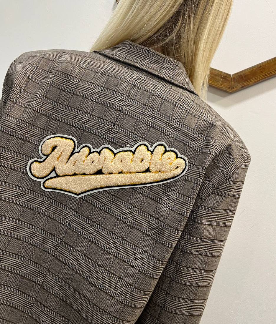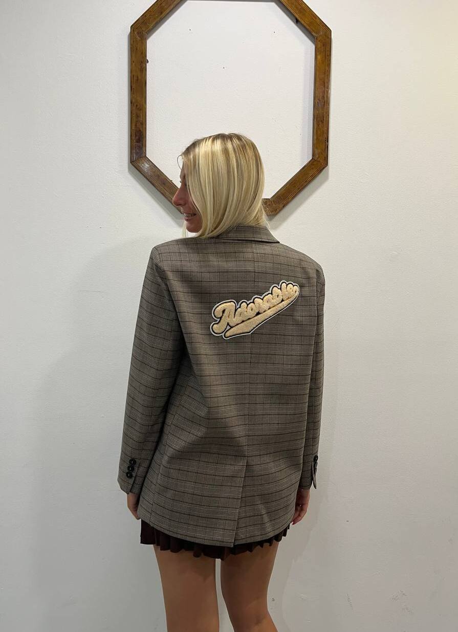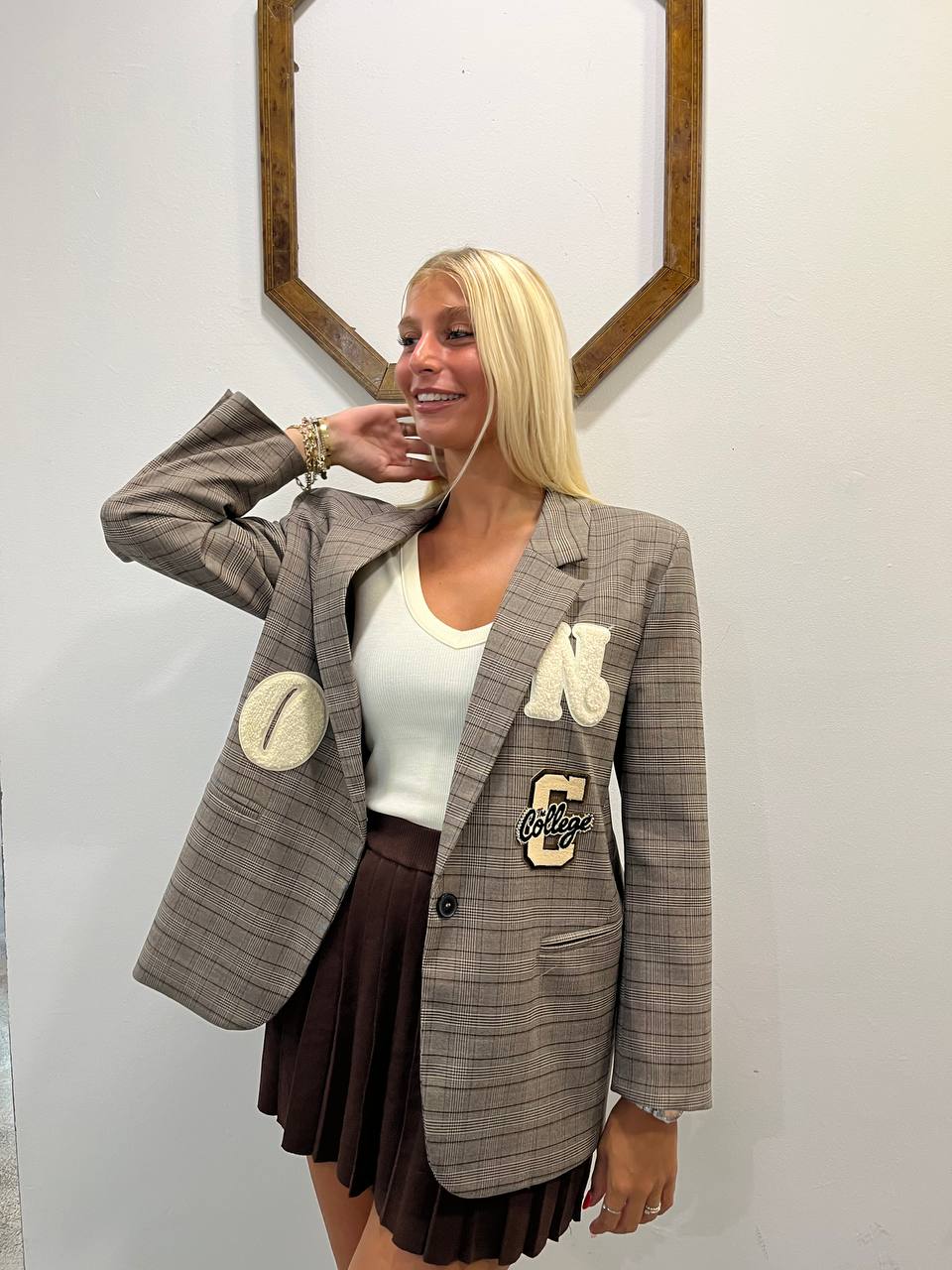 Blazer dal taglio oversize, un capo d'abbigliamento versatile e di tendenza. La fantasia a quadri in tonalità neutre dona un tocco classico, mentre le patch in stile college e il bottone a contrasto lo rendono originale e sportivo. Le tasche frontali e il collo a revers lo rendono un capo adatto per ogni occasione, dal più formale al casual.