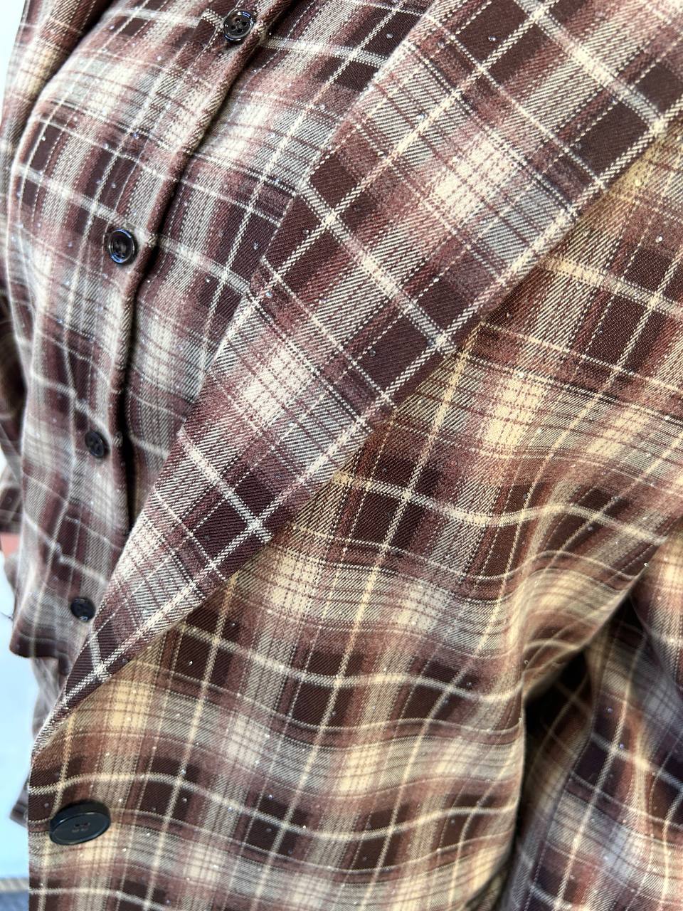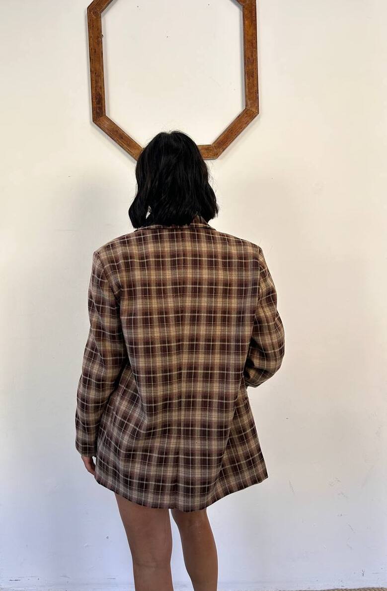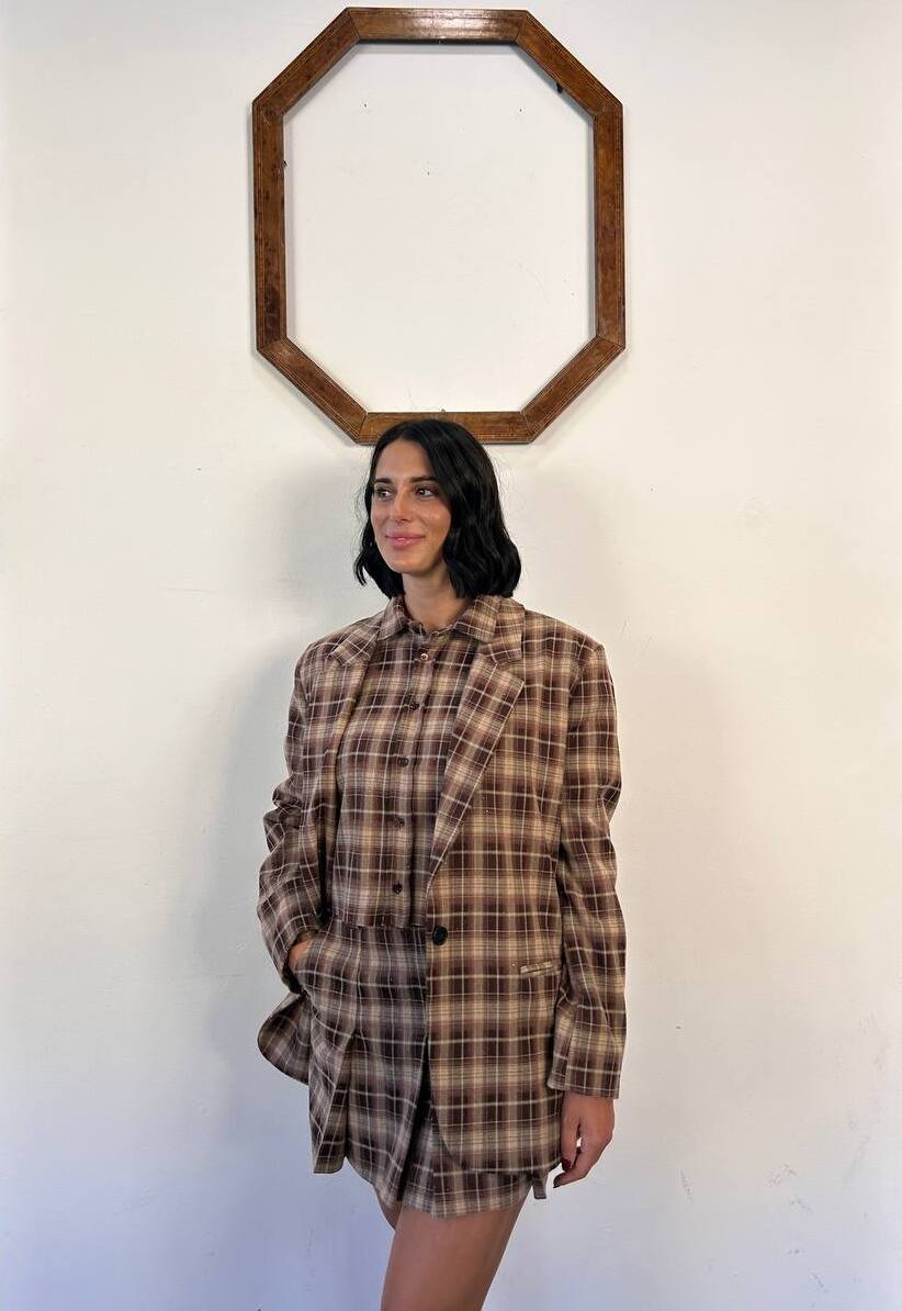 Giacca a quadri dal taglio maschile, con revers classico e chiusura monopetto a un bottone. Il tessuto leggero e la fantasia le conferiscono uno stile vintage e contemporaneo allo stesso tempo. Ha tasche frontali applicate e spalle leggermente strutturate per un look elegante ma disinvolto, perfetta da abbinare sia in coordinato che con capi basic per outfit versatili.