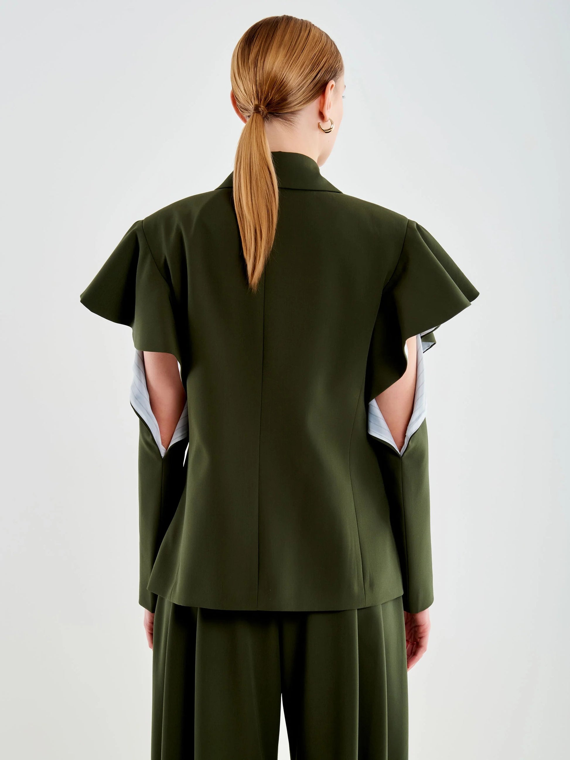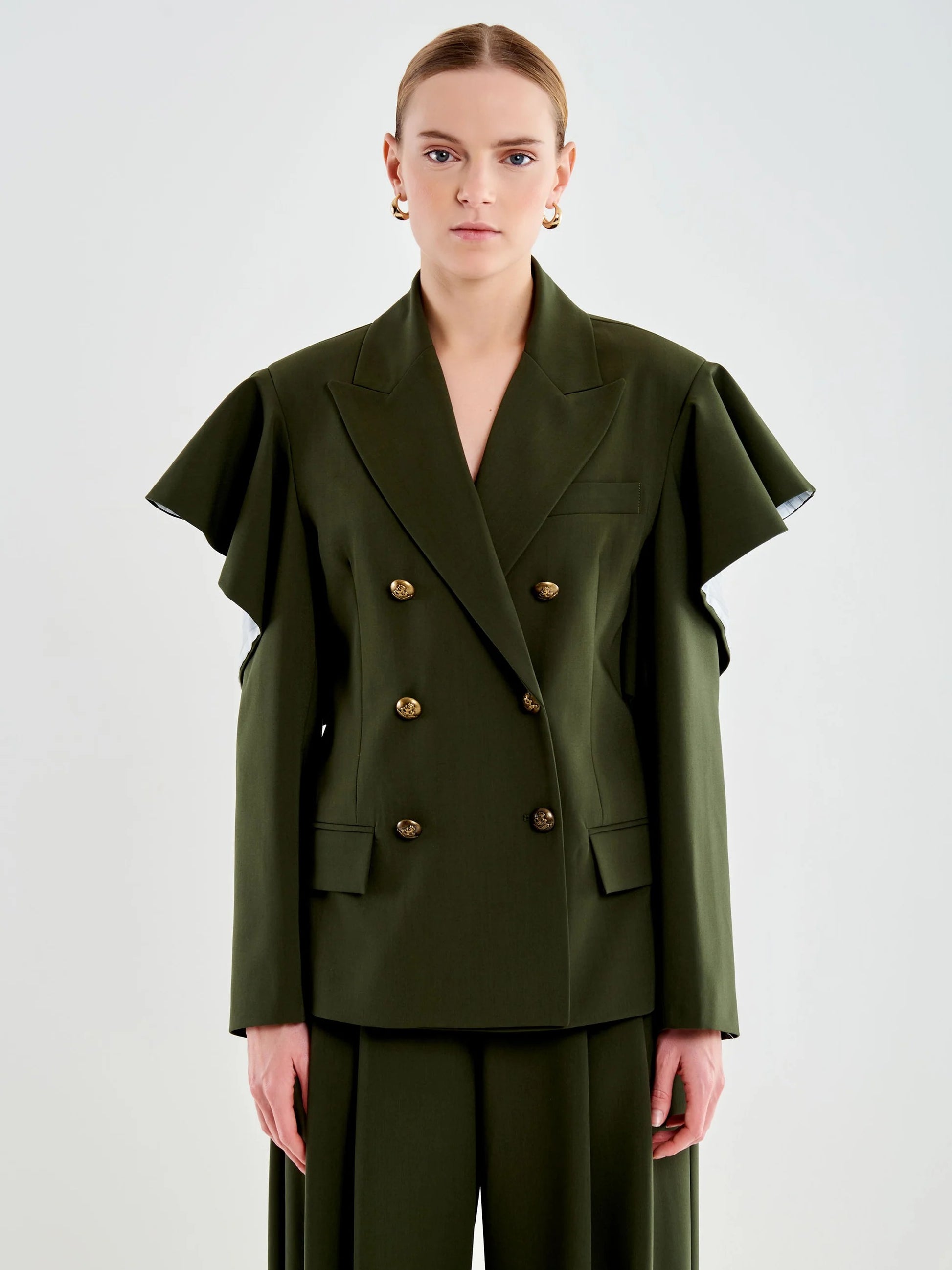 Blazer doppiopetto con revers. Tasche anteriori con patta e sul petto a filetto. Chiusura frontale doppiopetto con bottoni dorati. Maniche lunghe con rouches sulle spalle e apertura posteriore a livello gomito.