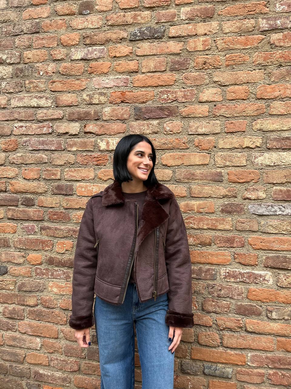 Giubbotto biker cropped con esterno effetto scamosciato ed interno in ecopelliccia. Maniche lunghe con polsino con risvolto. Collo a revers. Chiusura con zip leggermente laterale. Tasche frontali con zip.