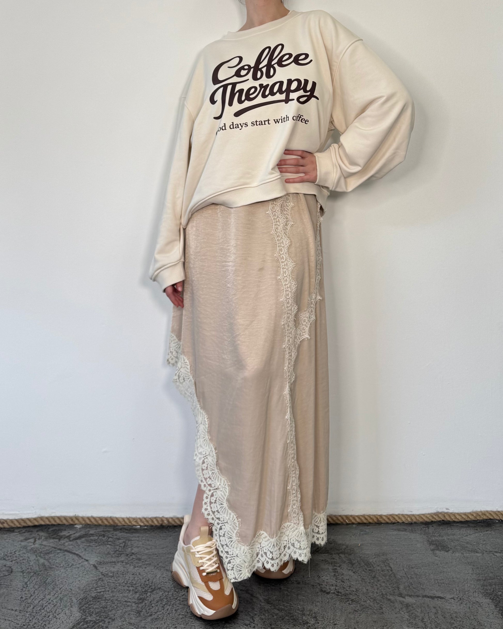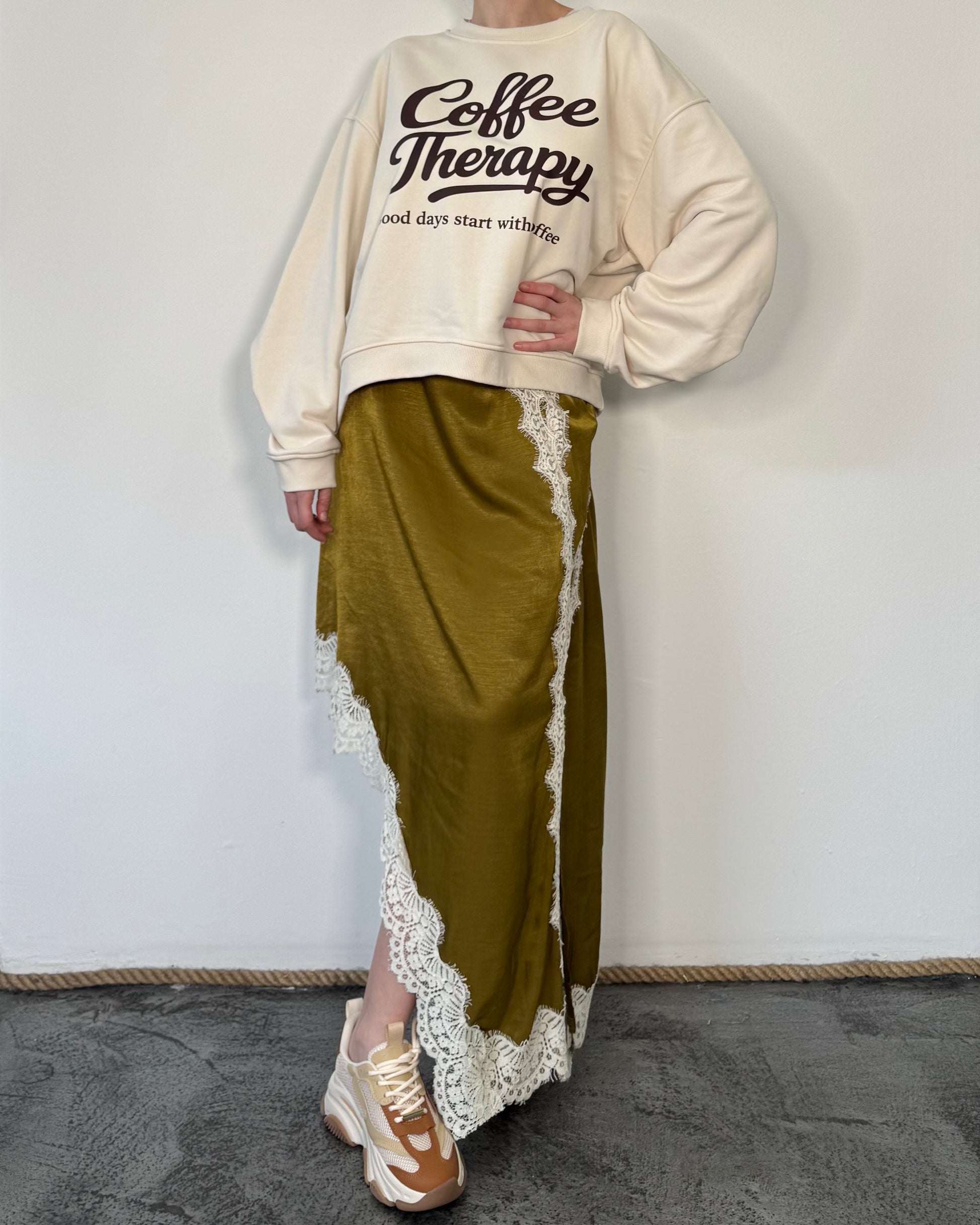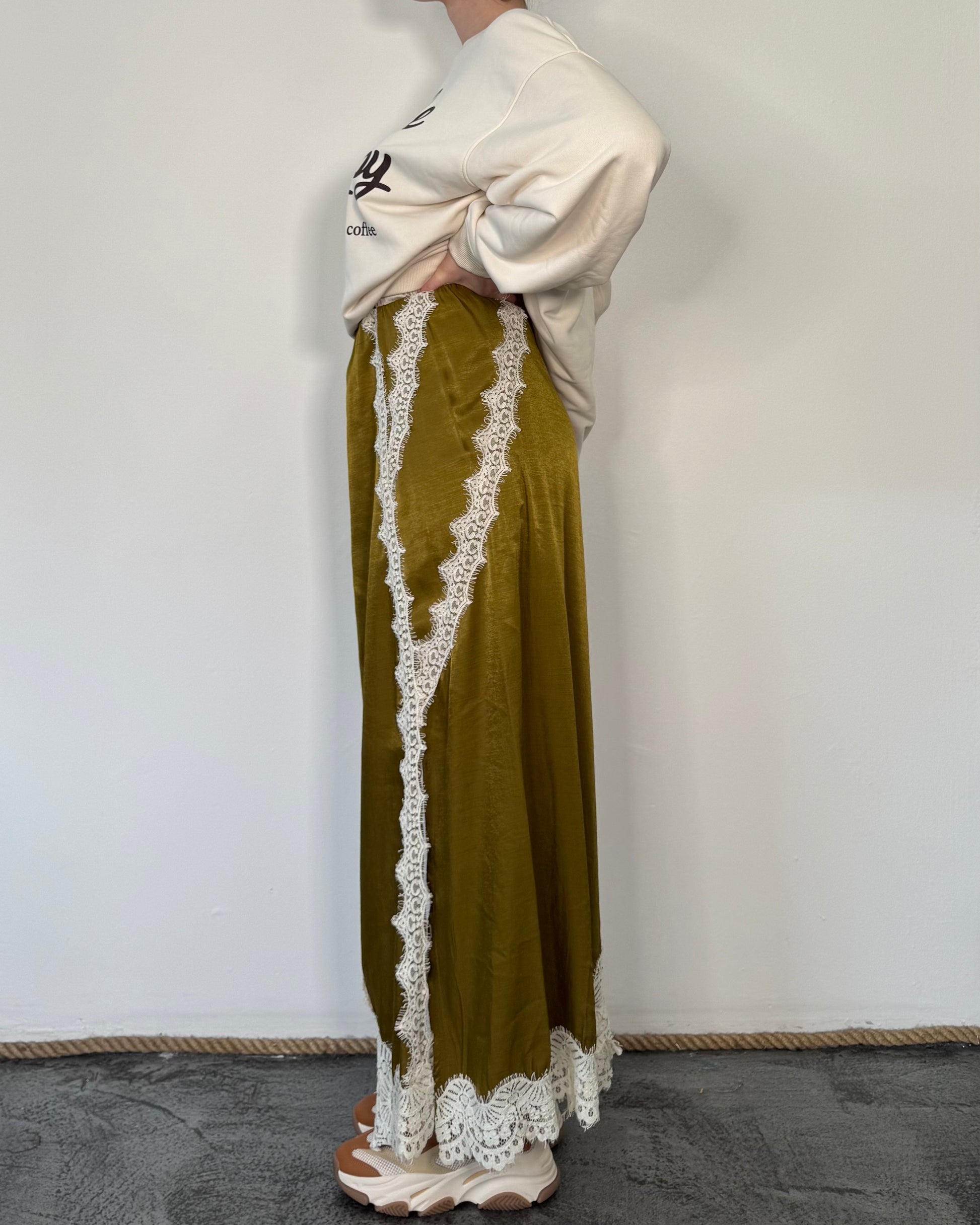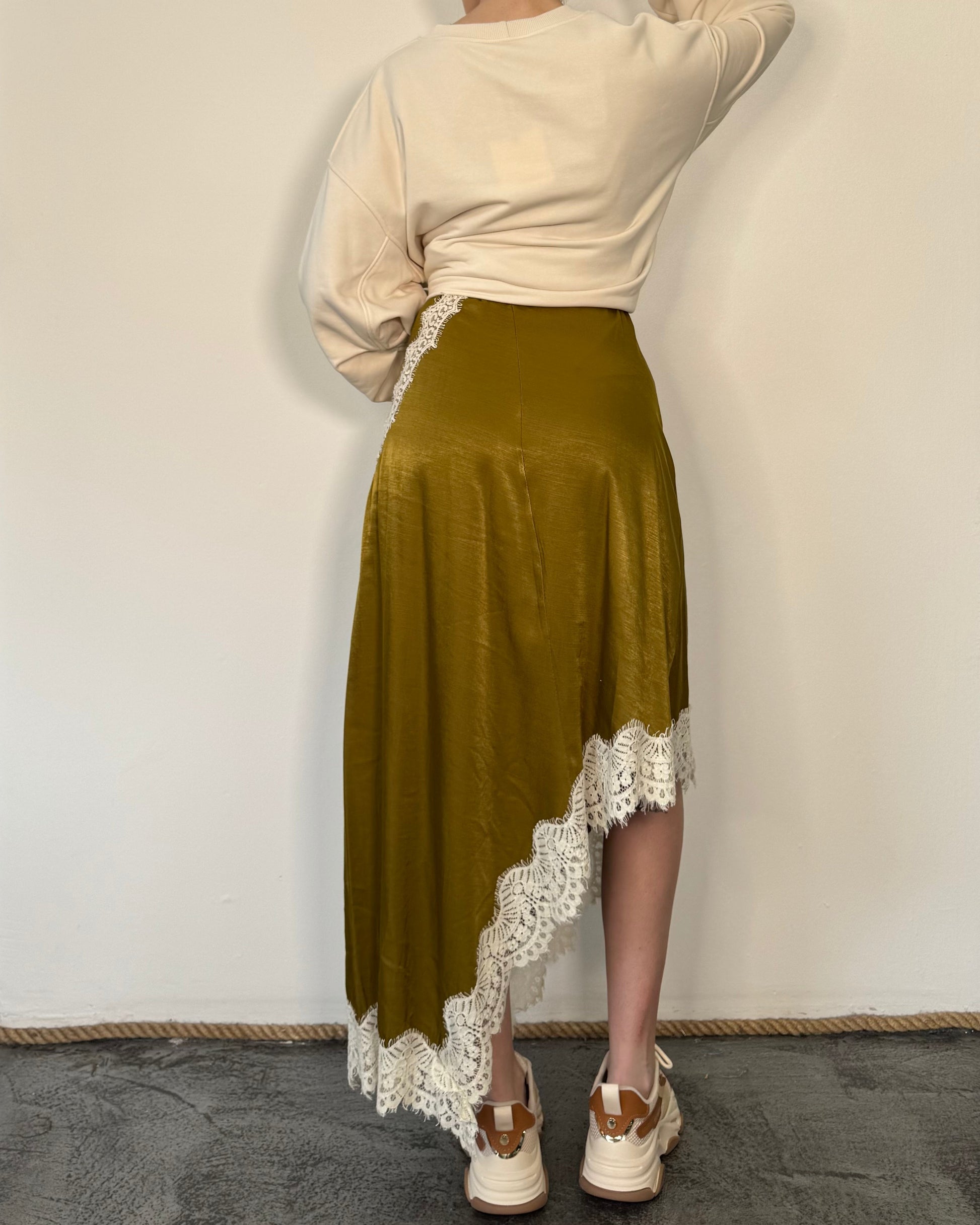 Gonna Longuette con taglio diagonale e pizzo.