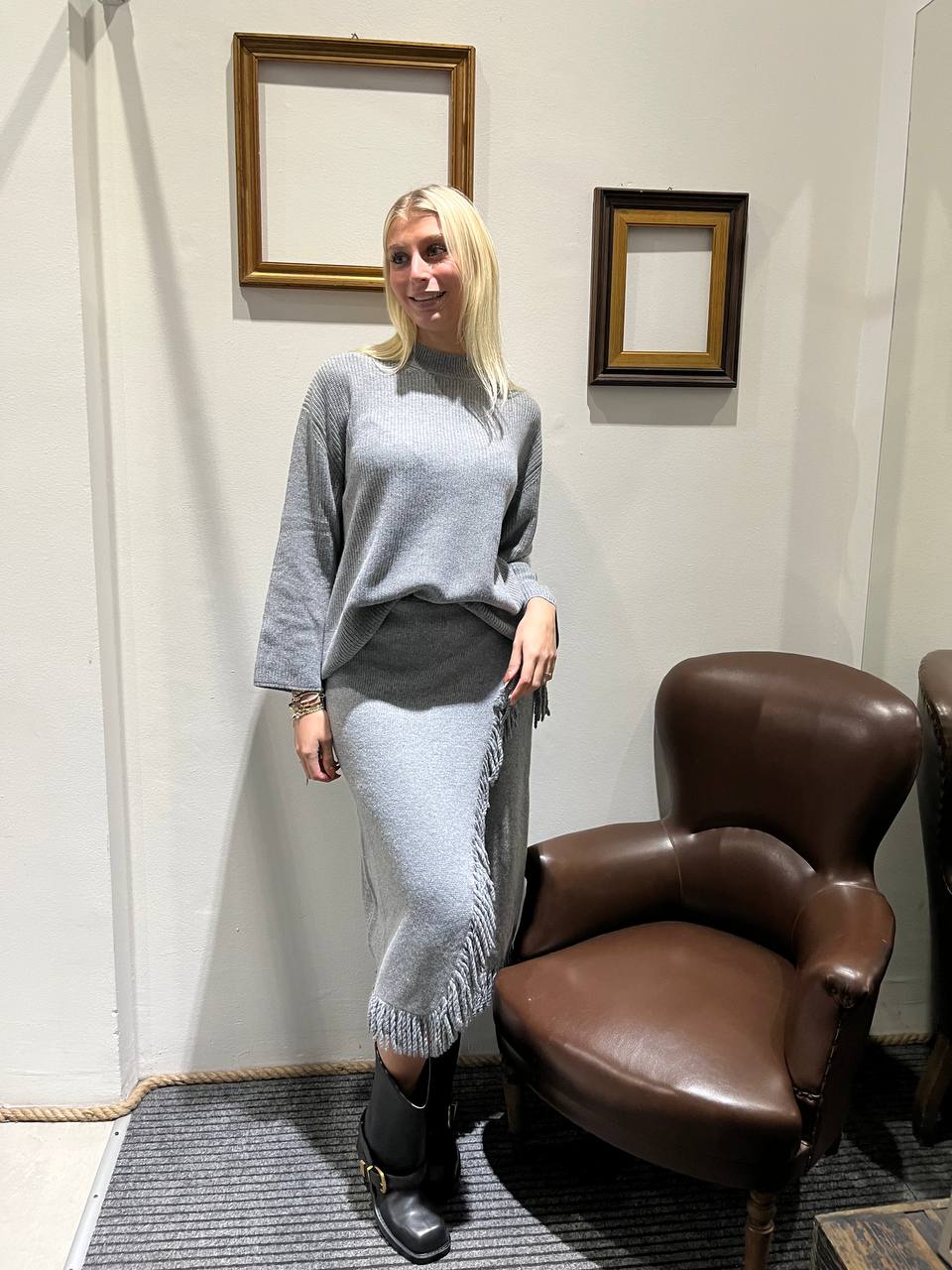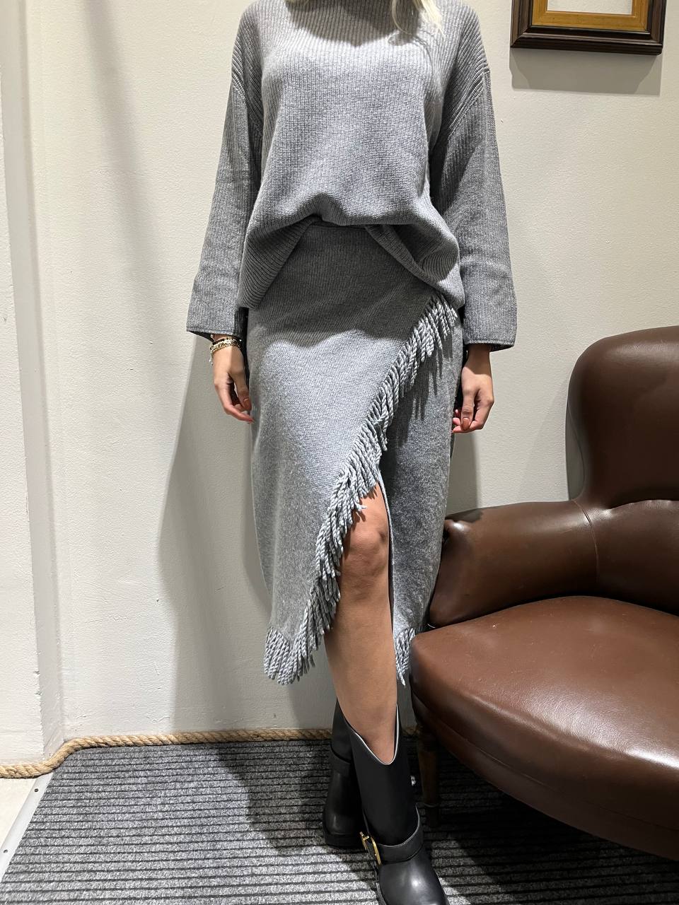 Questa gonna lunga che arriva sotto il ginocchio, è realizzata in maglia. Presenta un taglio leggermente affusolato, con uno spacco diagonale sulla parte laterale. Il dettaglio distintivo è la rifinitura in frange applicata lungo lo spacco asimmetrico e l'orlo.