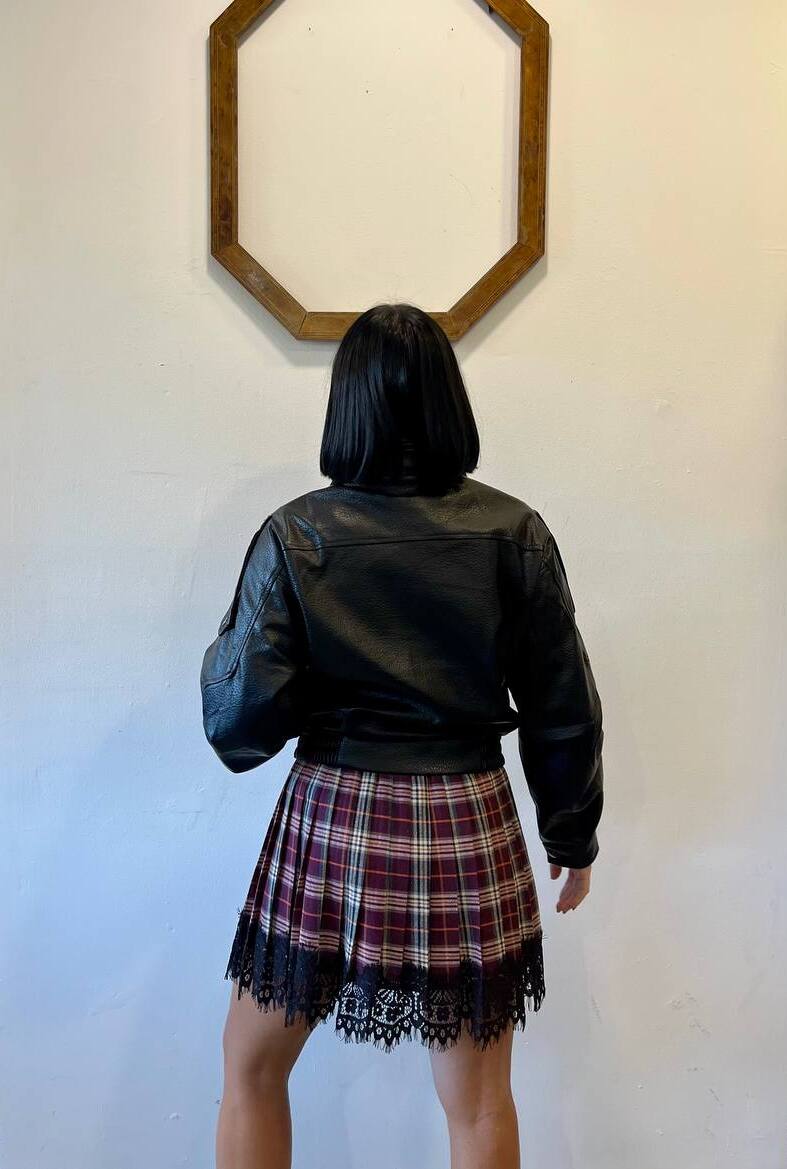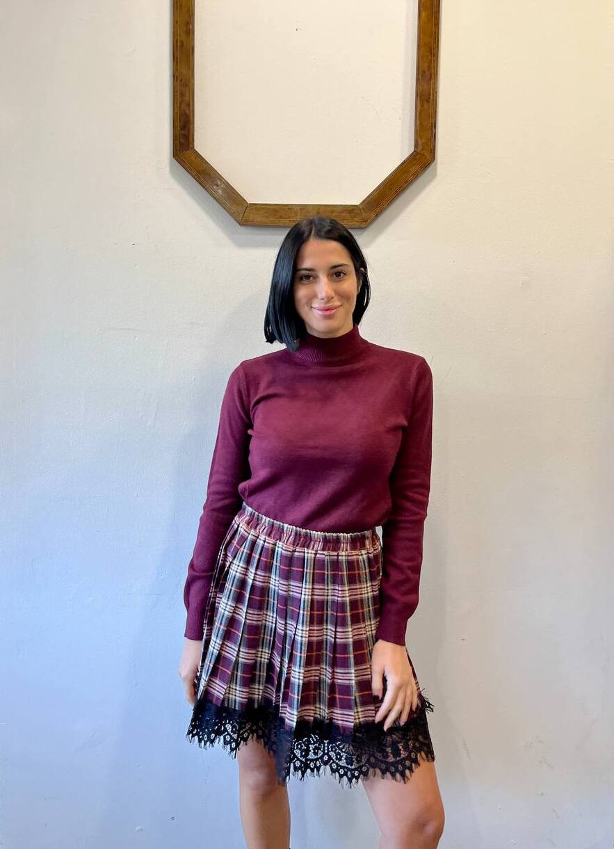 Questa gonna corta presenta un design sbarazzino con un tessuto a quadri versatile. È caratterizzata da un'elegante lavorazione plissé e da una vita elasticizzata per un comfort ottimale e una vestibilità facile. Il dettaglio distintivo è il bordo inferiore rifinito con un delicato pizzo nero, che aggiunge un tocco romantico e sofisticato. Perfetta per un look casual-chic.