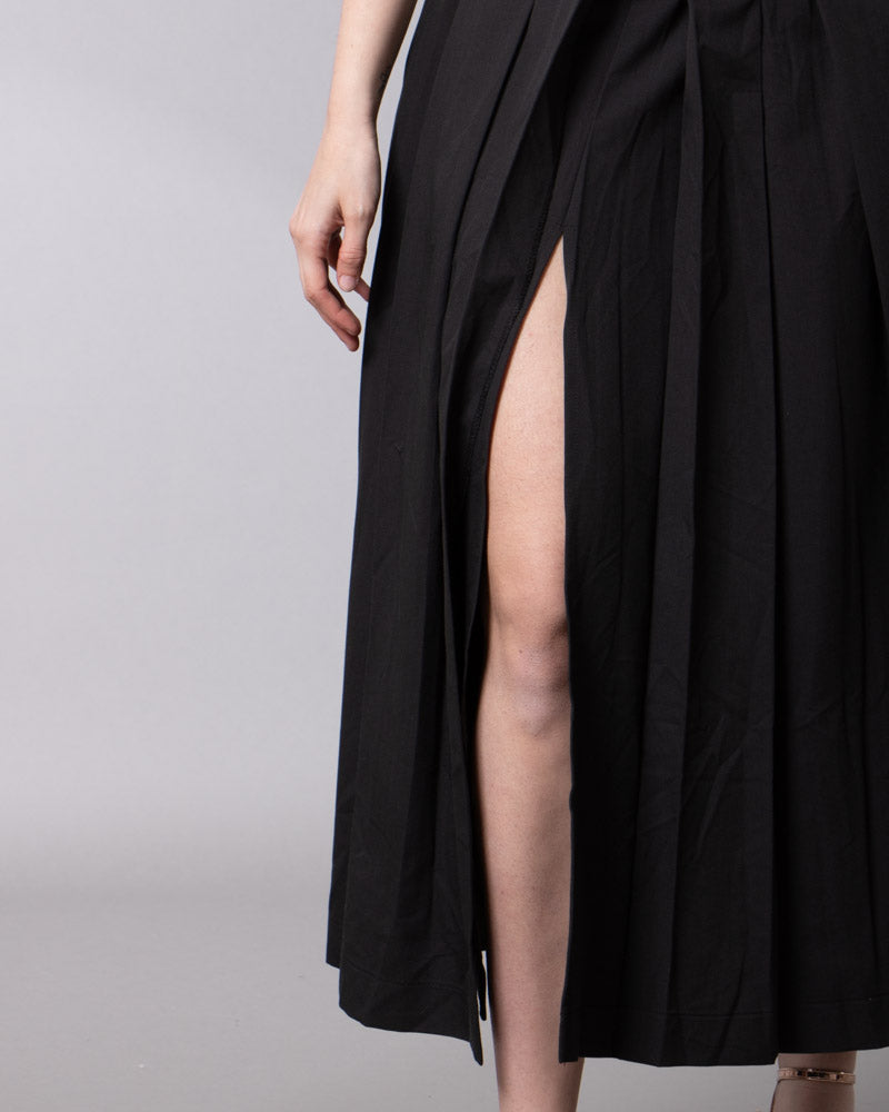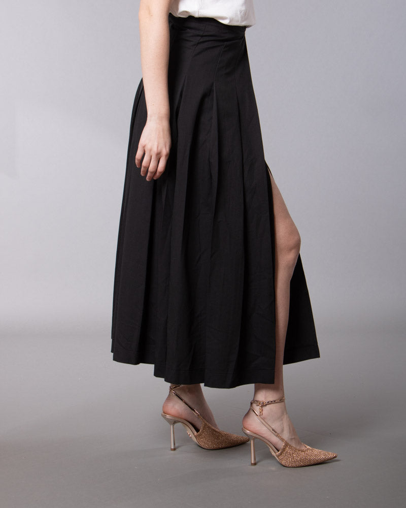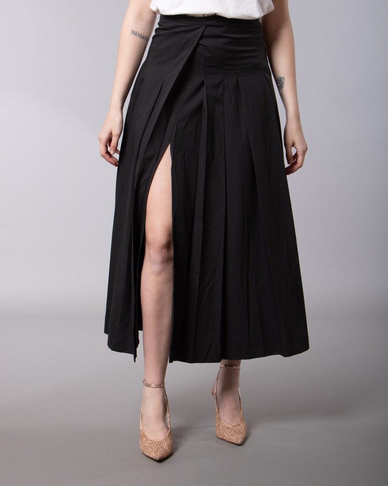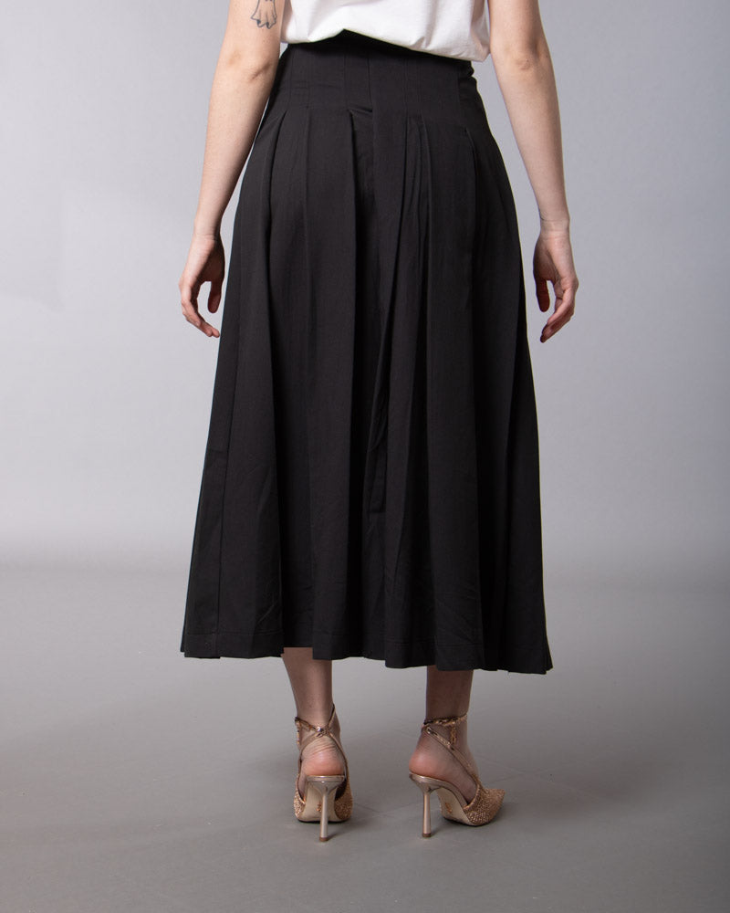 La gonna ha una linea ampia sul fondo. Spacco a scomparsa. Doppia fodera. Pieghe taglio vivo. Vita medio-alta. Chiusura zip laterale.
