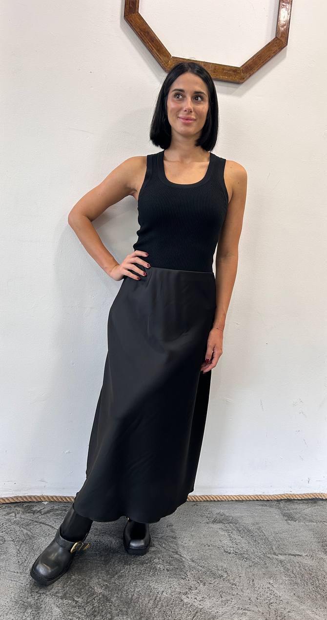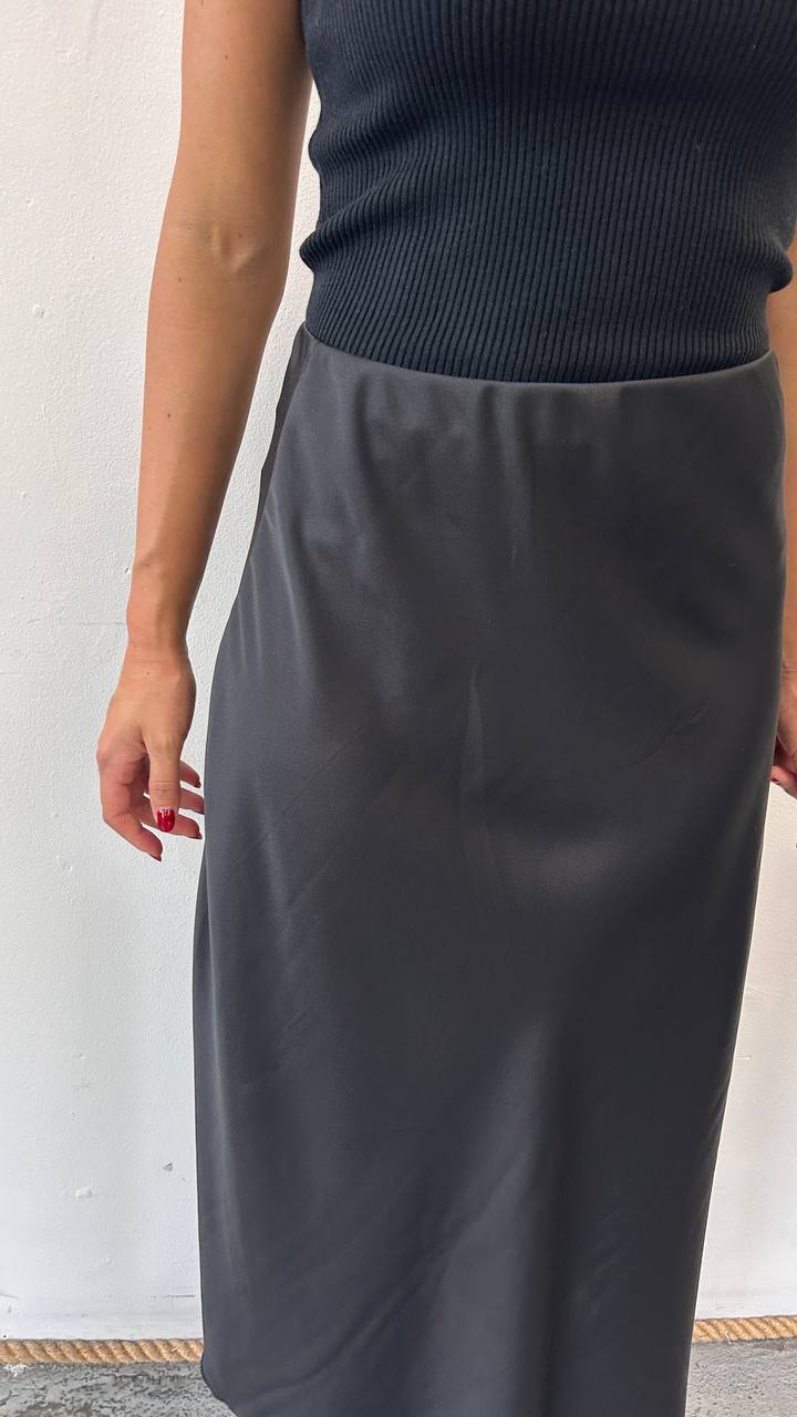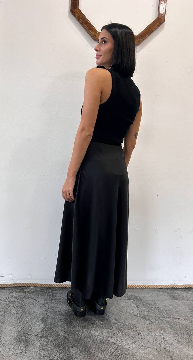 Questa gonna midi è un capo versatile e sofisticato, perfetto per ogni occasione. Realizzata in raso lucido, scivola elegantemente sulla figura e aggiunge un tocco di lusso al tuo look. La silhouette svasata e la lunghezza midi la rendono un classico senza tempo, ideale da abbinare a una semplice maglia per un look casual-chic, o a un top in pizzo per una serata elegante.