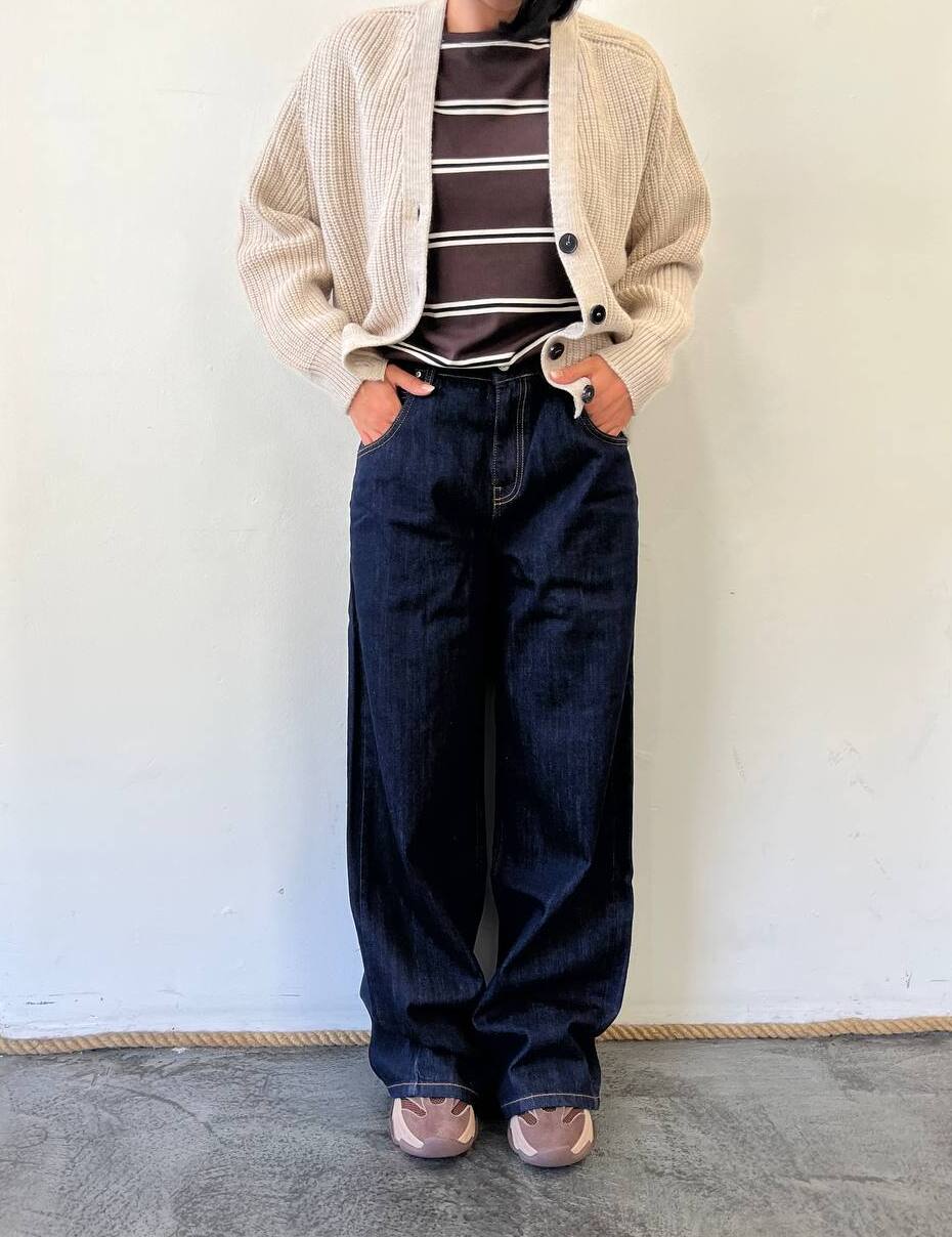 Jeans a vita alta in denim blu scuro con cuciture a contrasto. Modello a gamba ampia e lunga, con cinque tasche e chiusura a bottone e zip. Versatili e dallo stile casual-chic, ideali per abbinamenti sia sportivi che più eleganti.