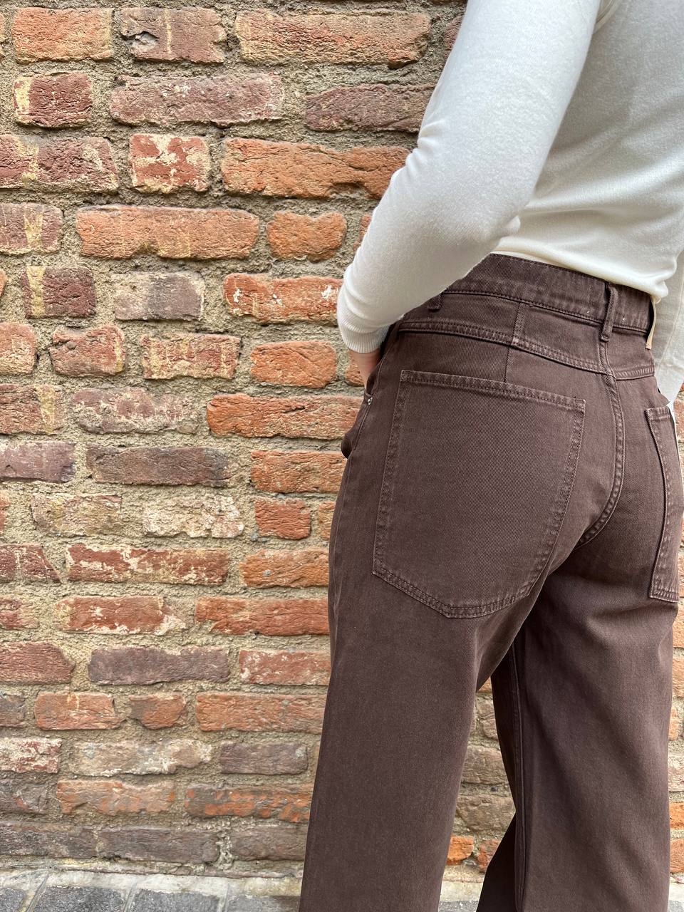 Jeans Ampio modello cinque tasche. Chiusura frontale con zip e bottone in metallo. Vita media gamba ampia. Denim moro.