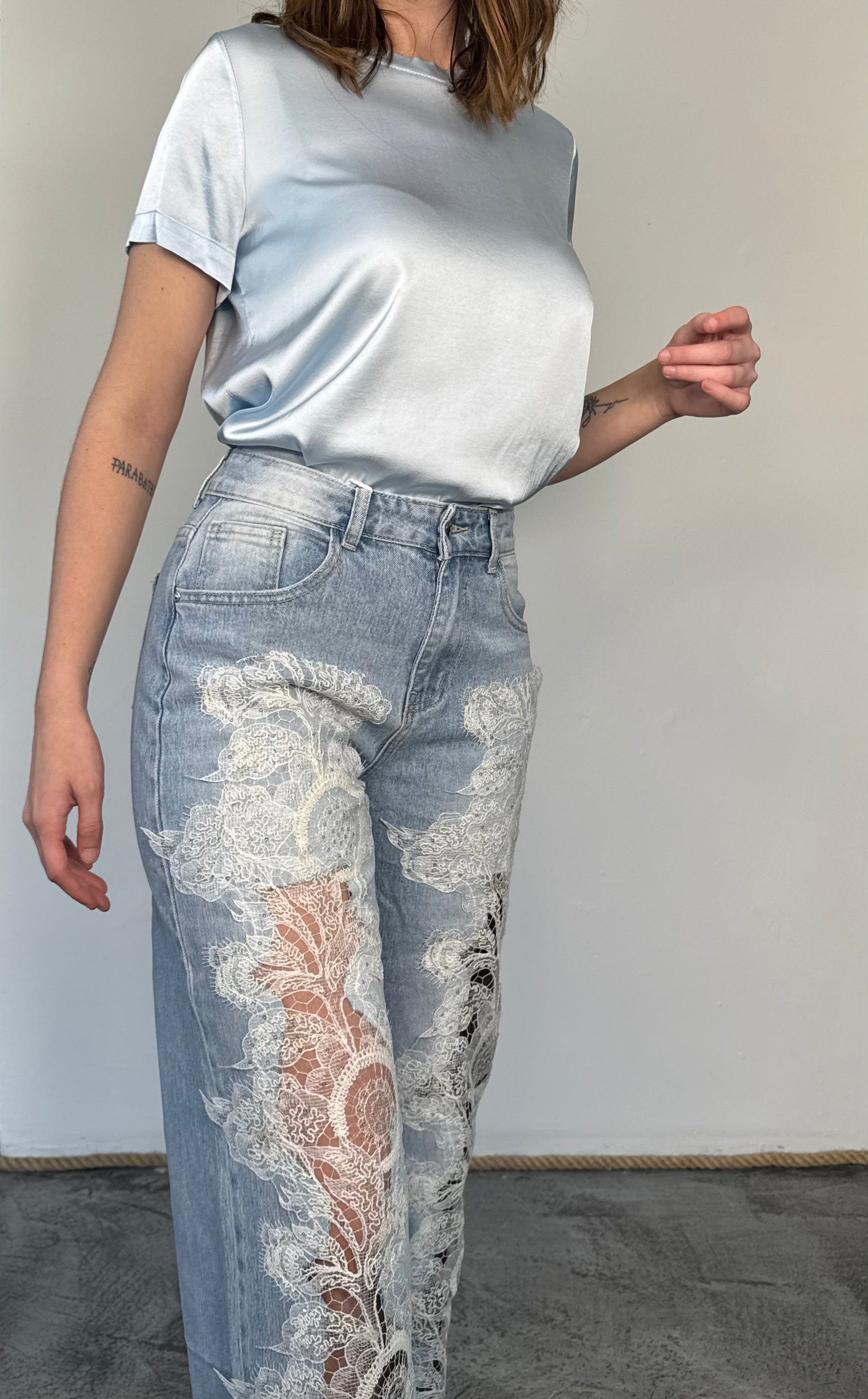 Jeans vita alta pizzo pailettato
