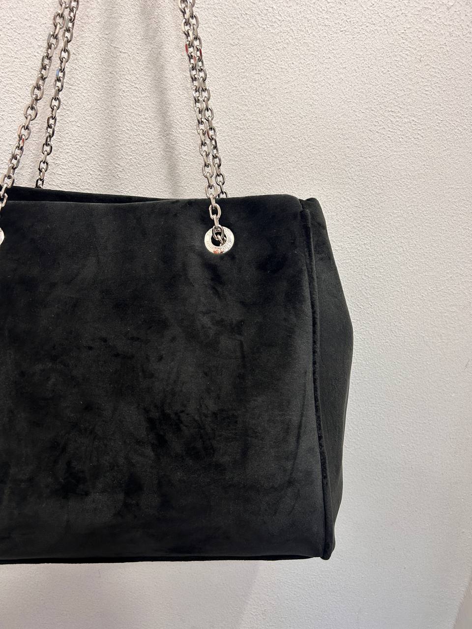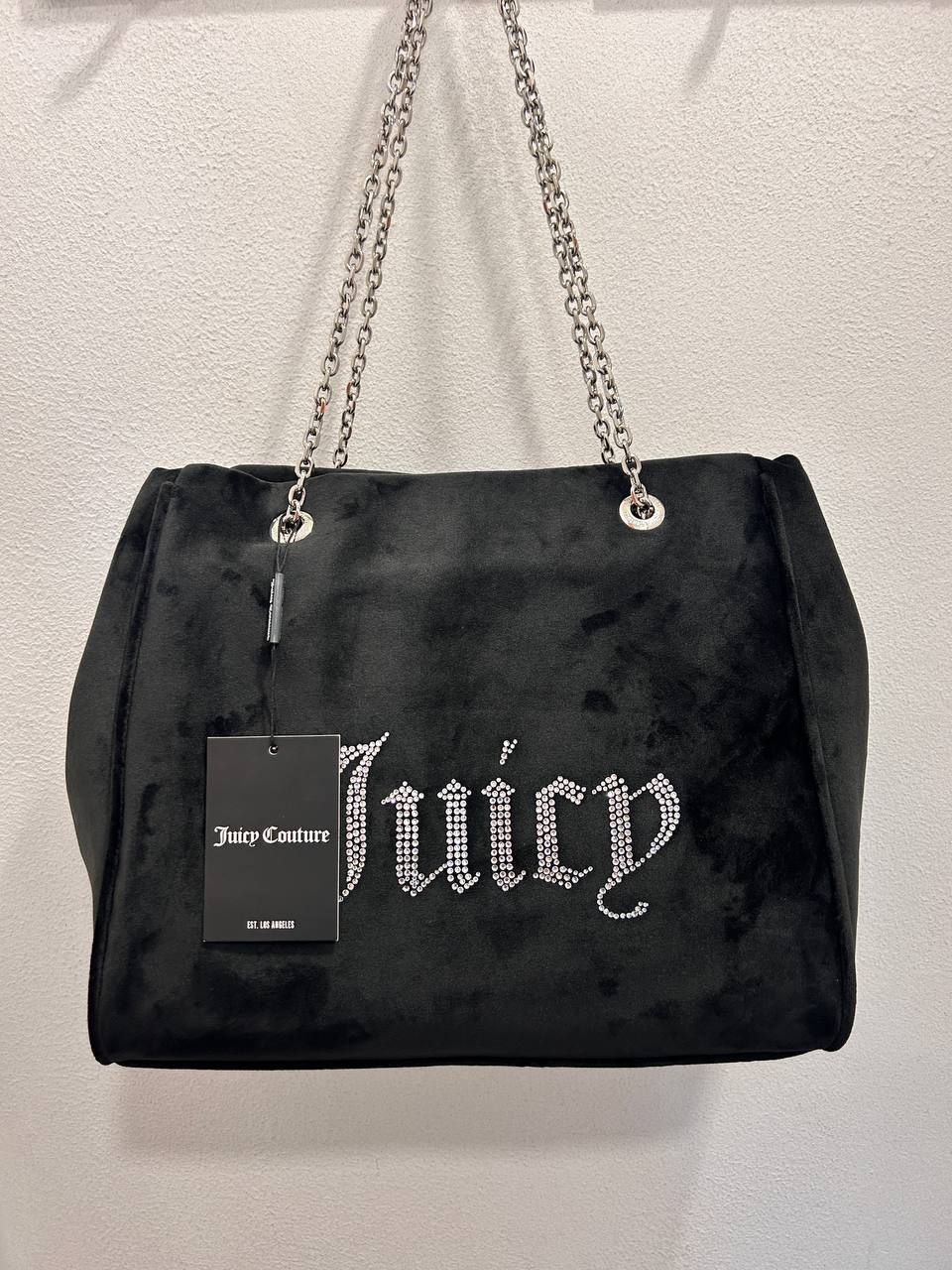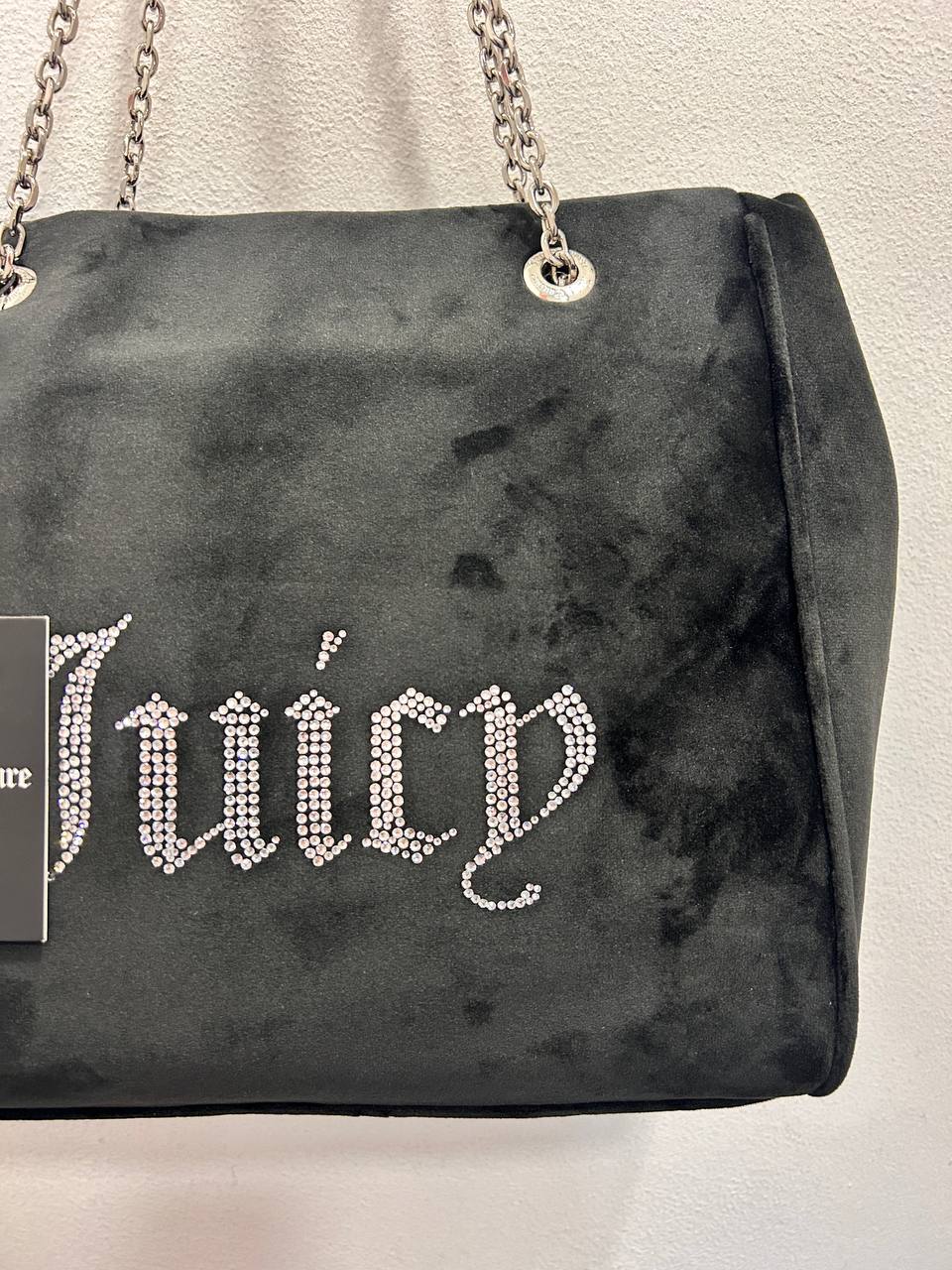 Borsa a spalla elegante e moderna, realizzata in tessuto vellutato. Il design è caratterizzato da due manici a catena di metallo cromato. Sulla parte anteriore, spicca la scritta "Juicy" in strass scintillanti, che aggiunge un tocco di glamour. La borsa ha una chiusura con cerniera metallica per garantire la sicurezza del contenuto.