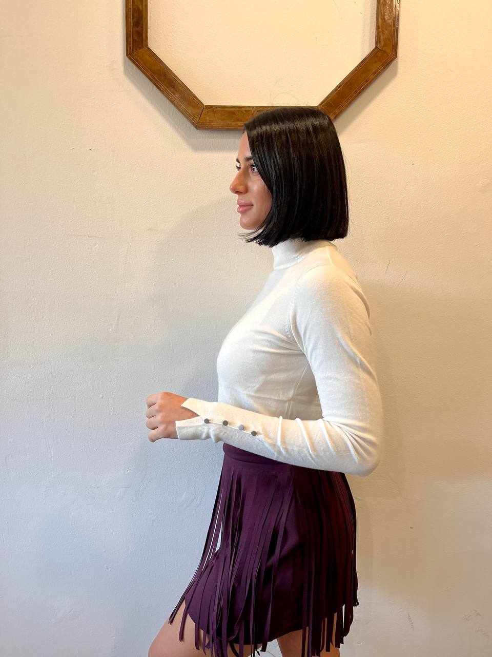 Questa maglia è un capo versatile ed essenziale, caratterizzata da un elegante collo alto che può essere lasciato ripiegato. La lavorazione in maglia liscia e sottile offre una vestibilità aderente e confortevole, ideale per essere indossata sotto giacche o da sola. Le maniche lunghe presentano un piccolo dettaglio a bottoni sul polsino. Perfetta per ogni stagione come base raffinata.
