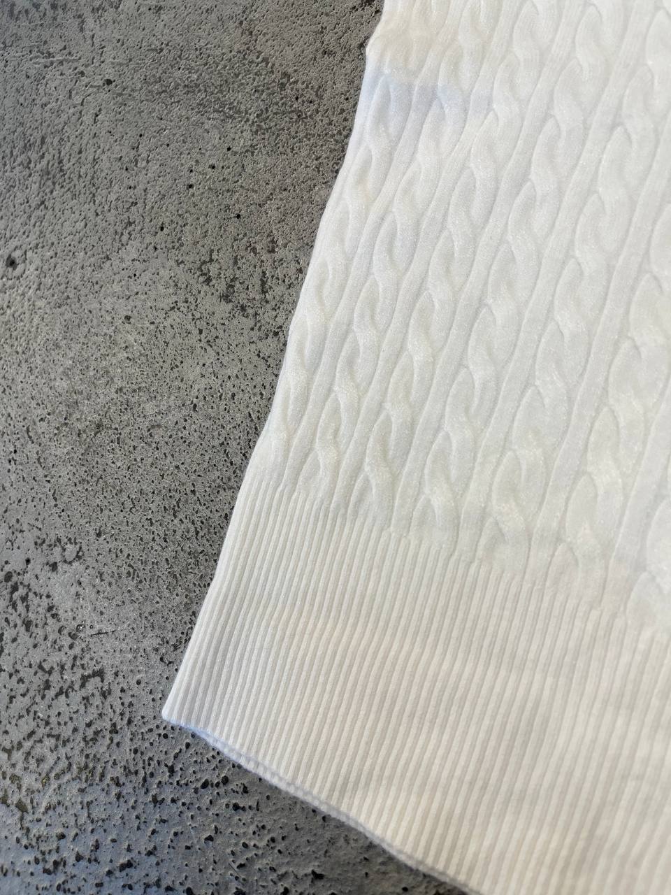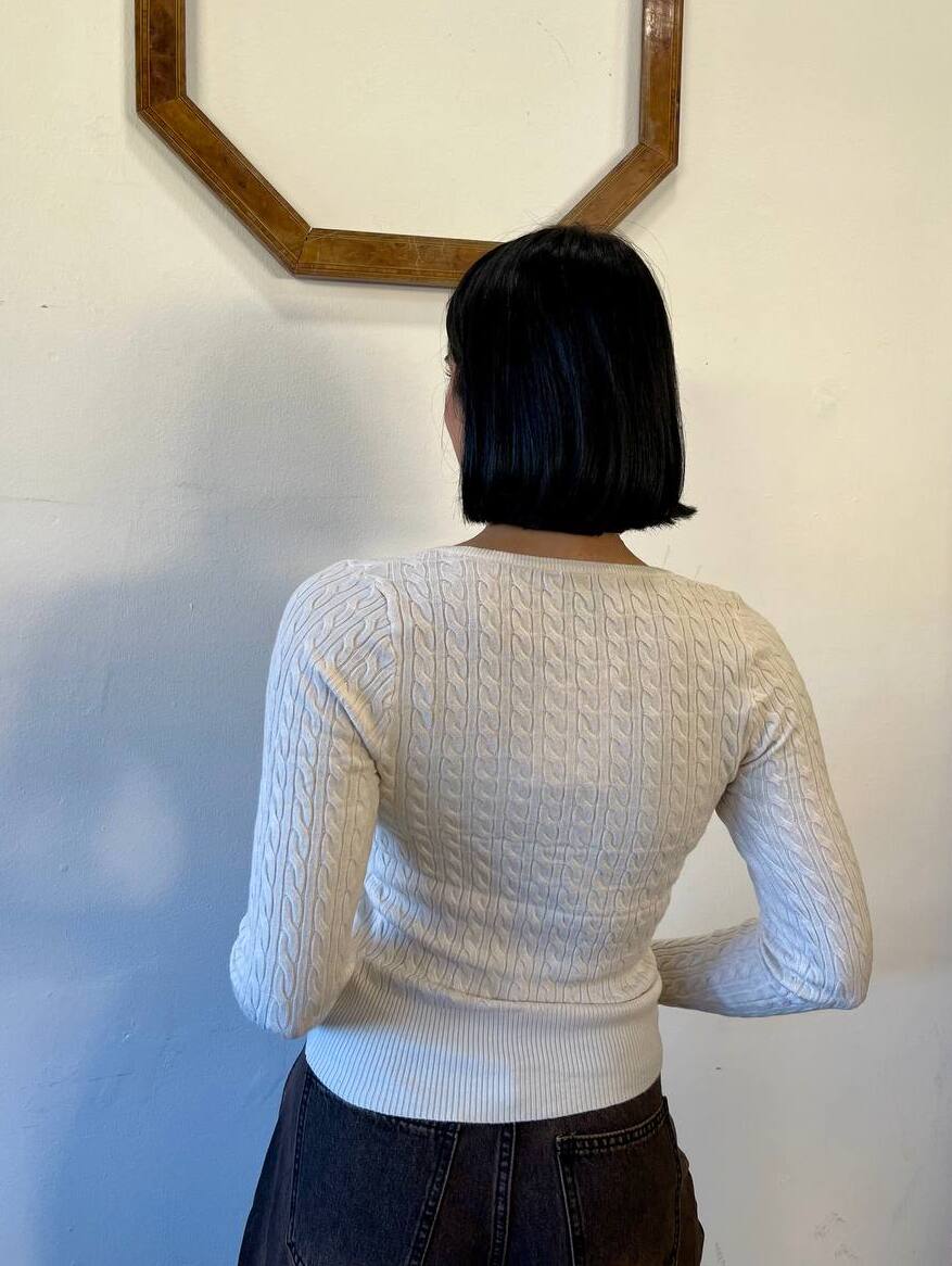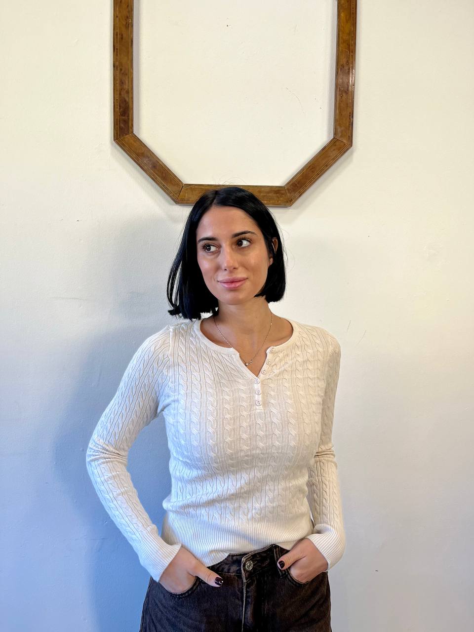 Questa maglia a maniche lunghe offre un design aderente e una vestibilità che valorizza la figura. Realizzata in un tessuto a costine con una lavorazione a treccia sottile, presenta uno scollo arrotondato con una chiusura parziale a bottoni sul davanti, che aggiunge un dettaglio classico e femminile. È il capo perfetto da indossare come base sotto una giacca o da solo per un look pulito e sofisticato.